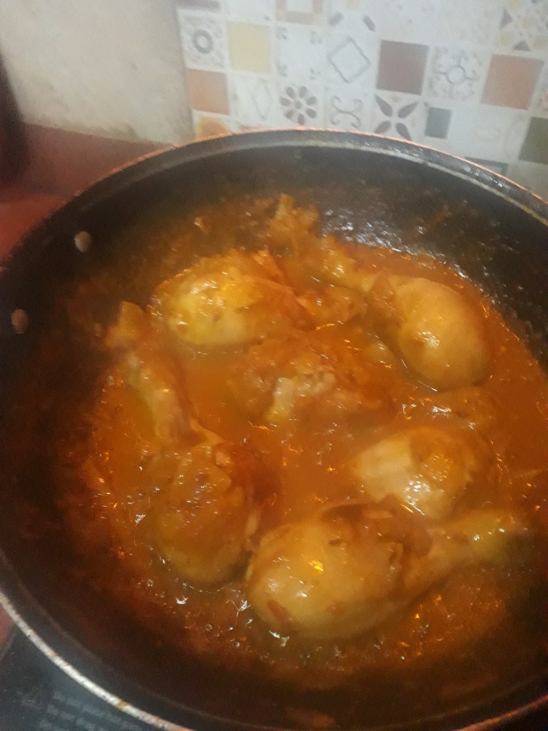 8. Put chicken pieces (I used leg pieces) and water in pan. And heat till, pieces are sot and water dries out. Then the chicken snacks are dry and ready to be taken with drinks and in the misty evenings!