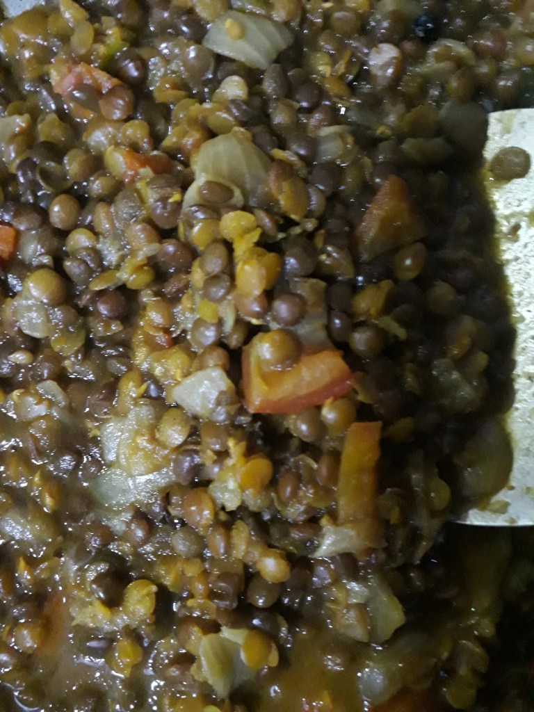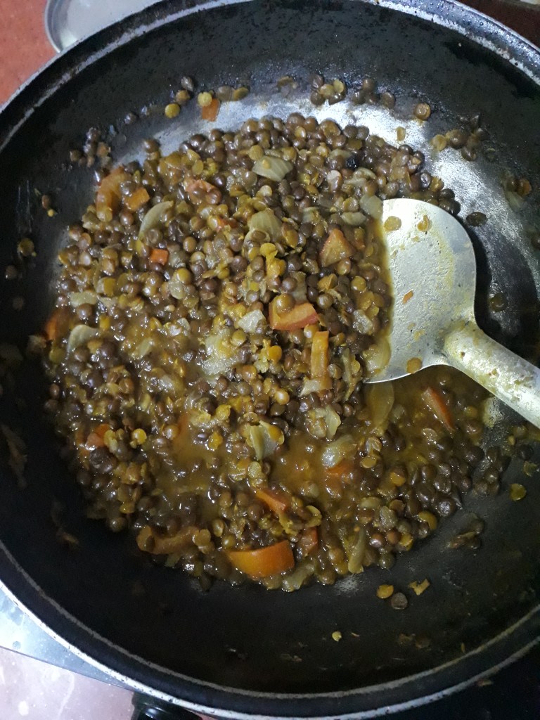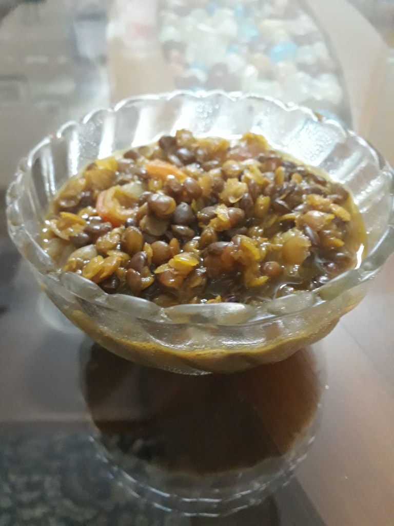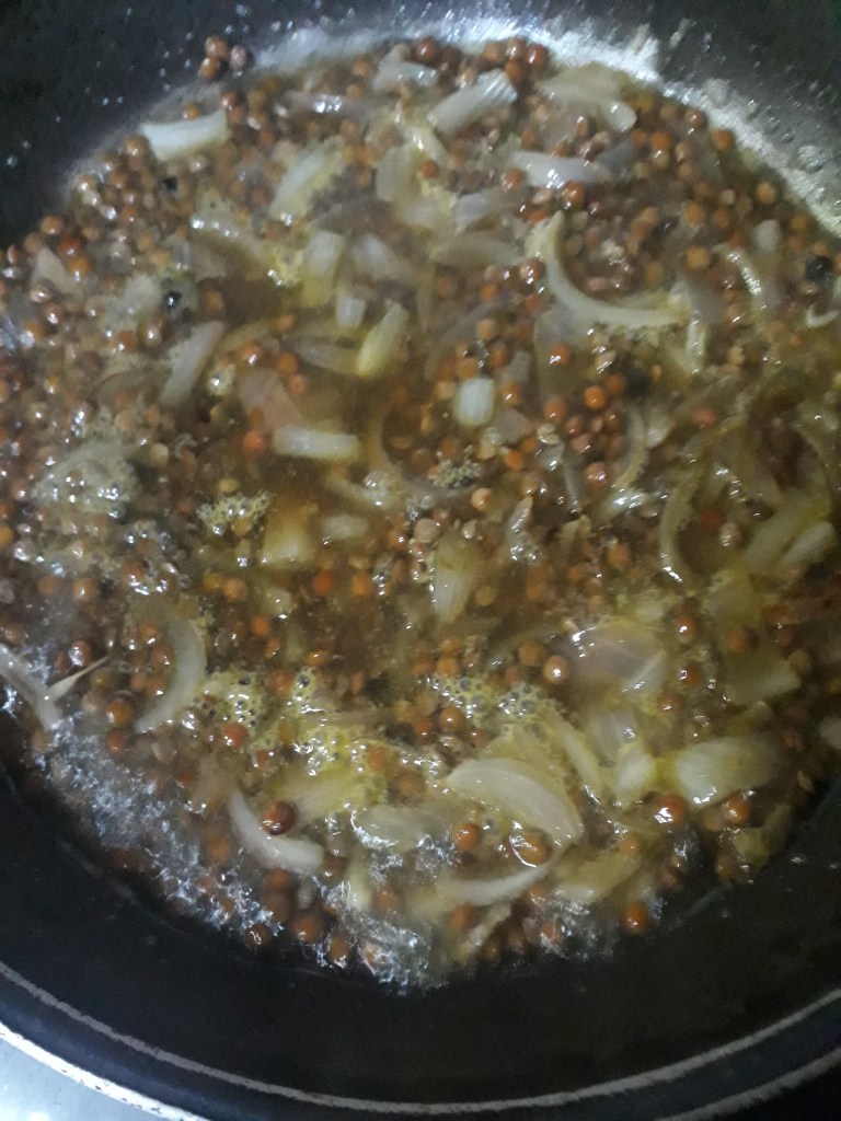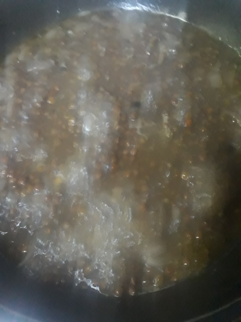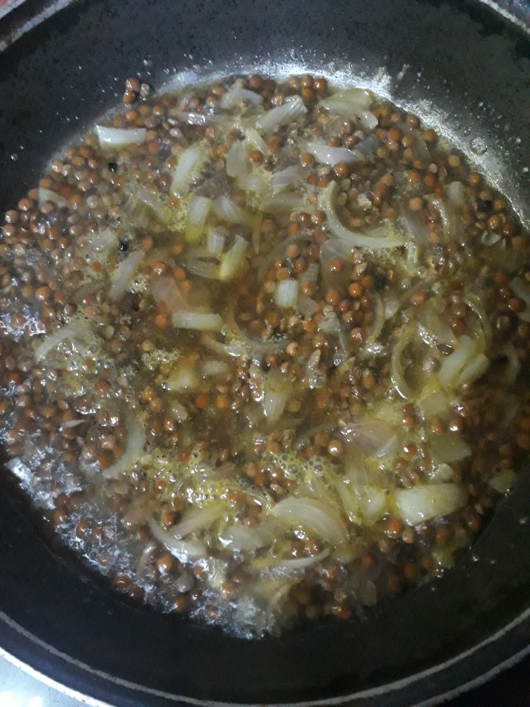5. Let onions change it color and then put the washed lentils with the water it is soaked it.
