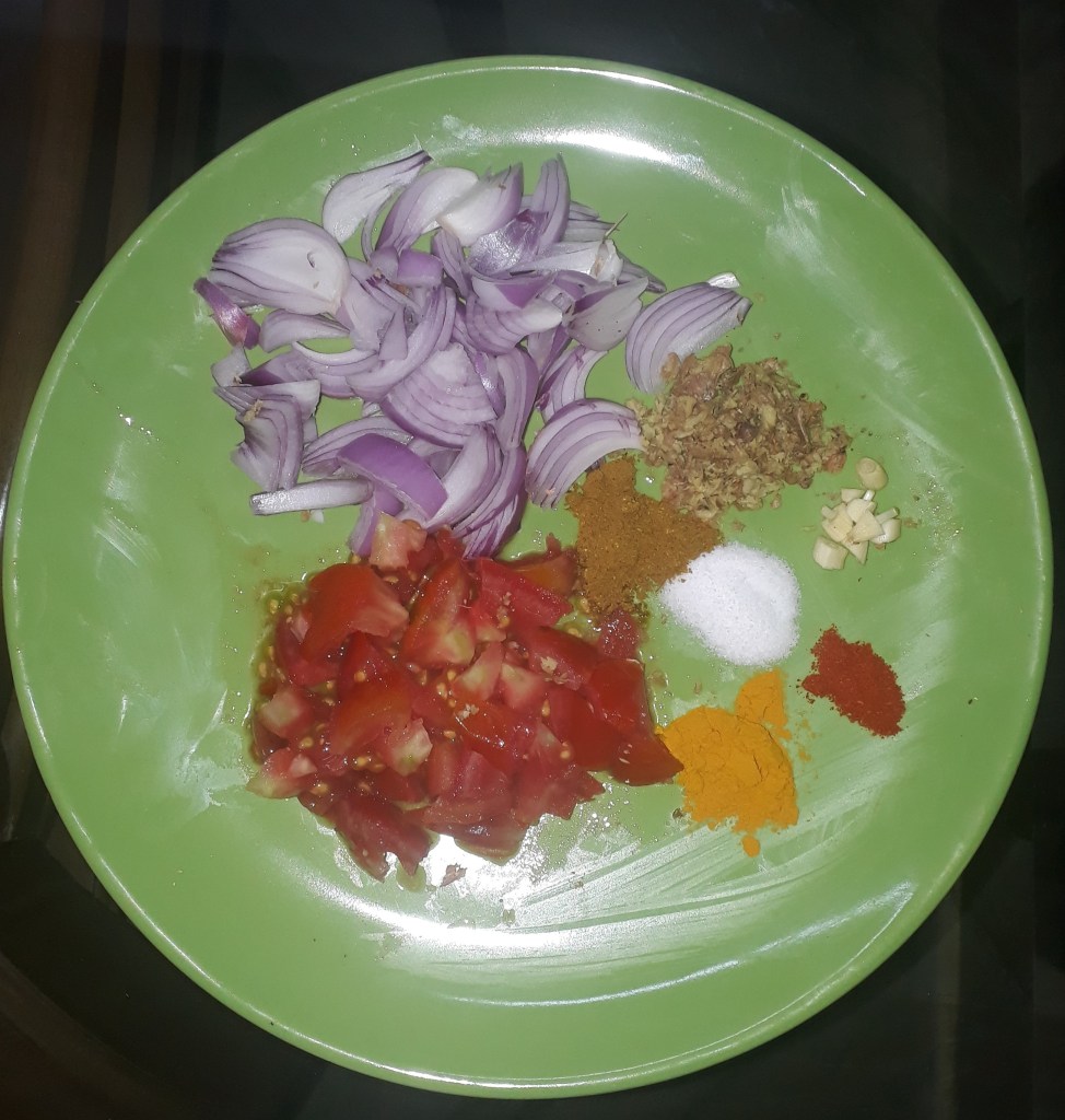 - Put salt, red chili, grinded ginger, chopped garlic, turmeric powder, spices (cinnamon, pepper…..) as per taste, and/or green chili for more flavor