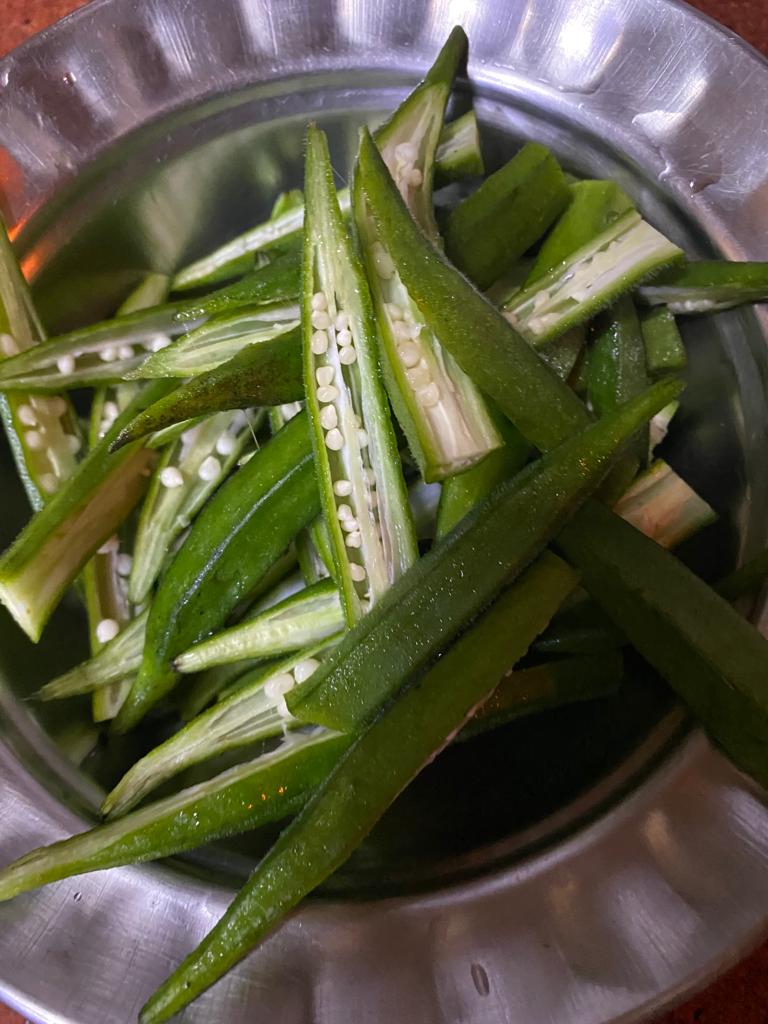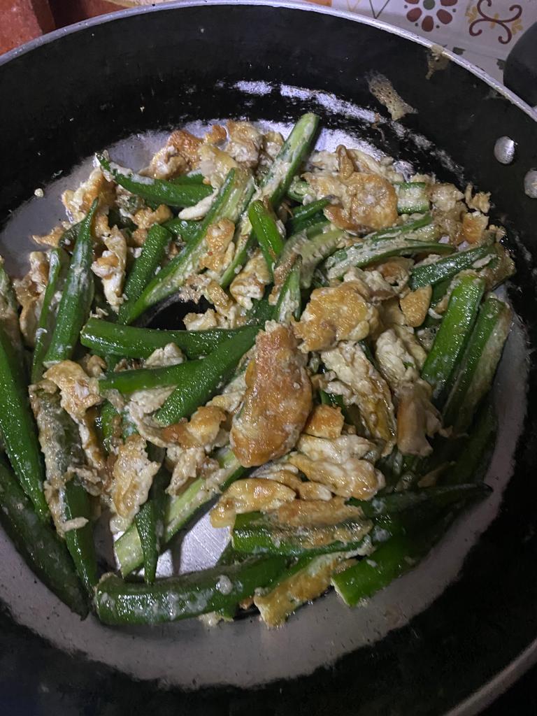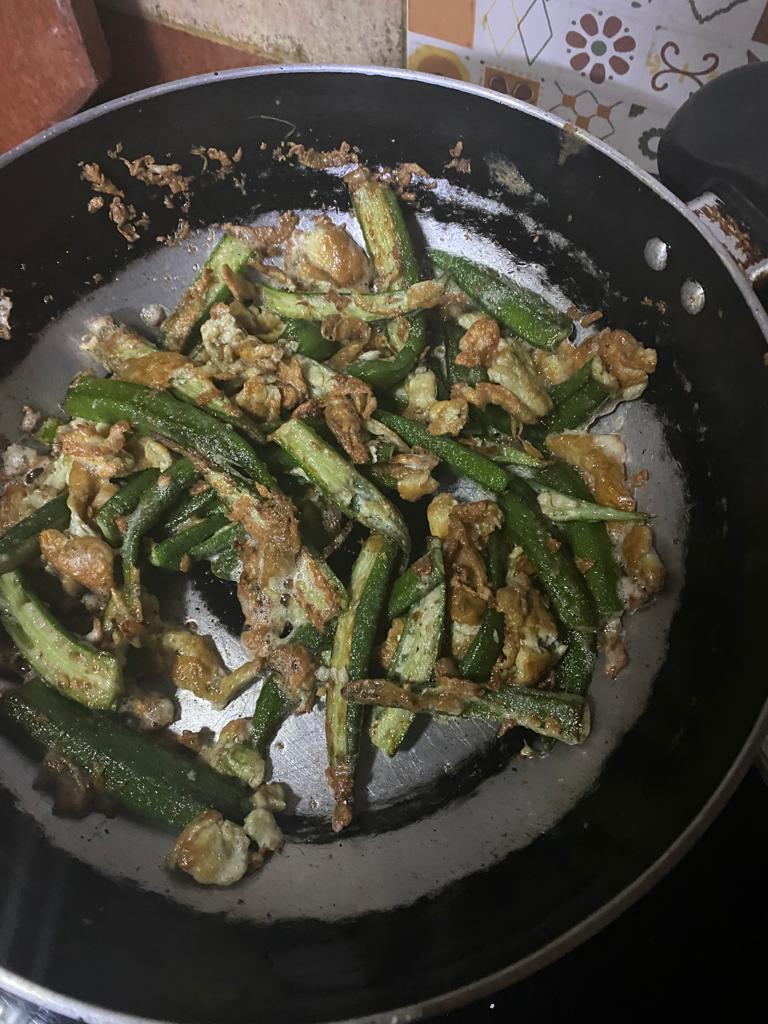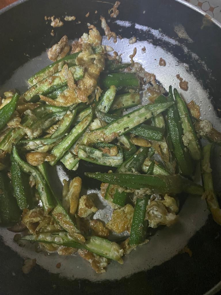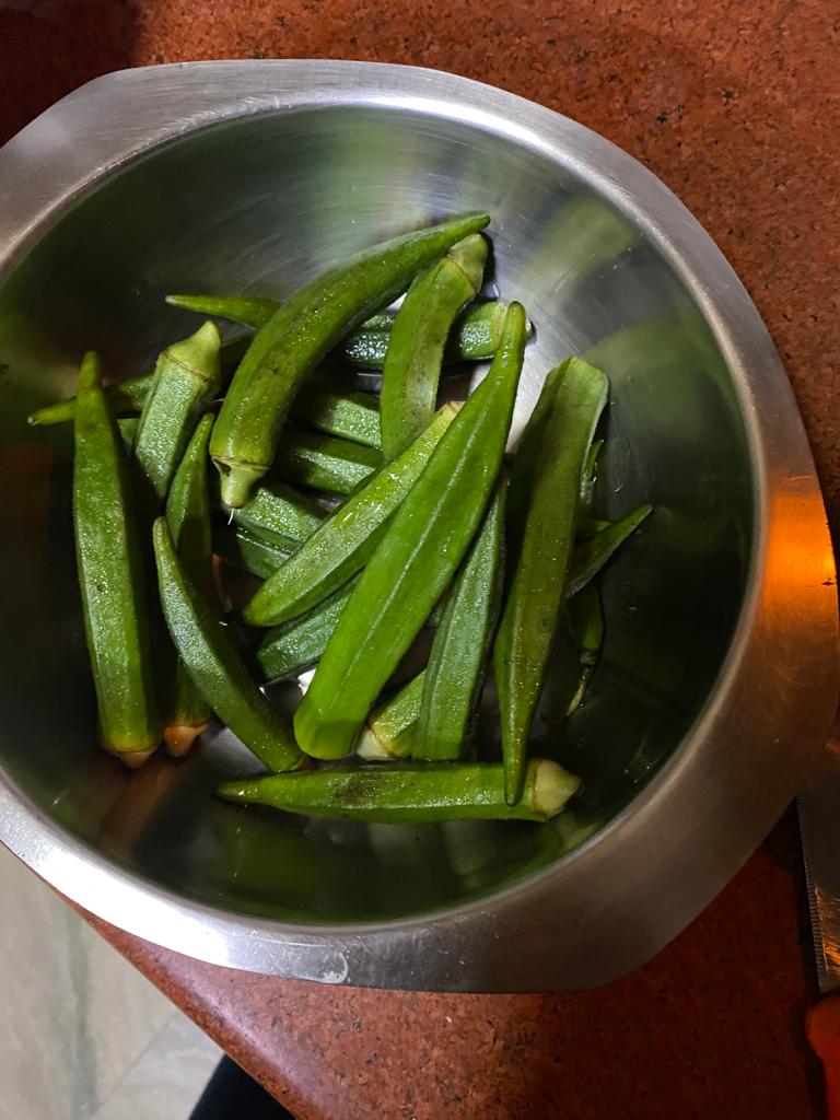 Ingredients: 100 grams ladyfinger, salt, green chili, 3 eggs, oil. That is it.