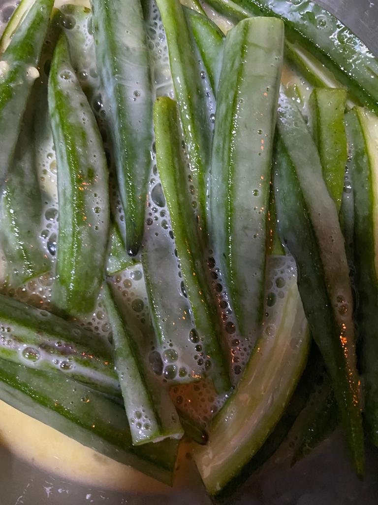 Step 1. Take 100 grams of ladyfinger, wash it and the cut them vertically after removing the front and end of the ladyfinger.
