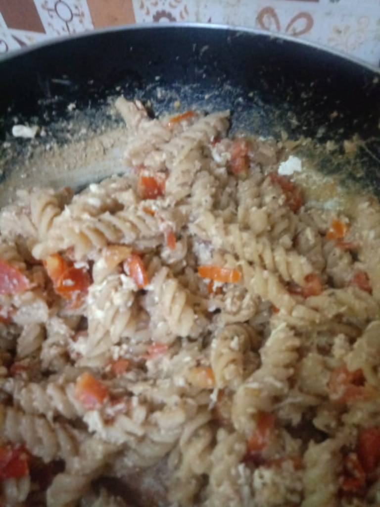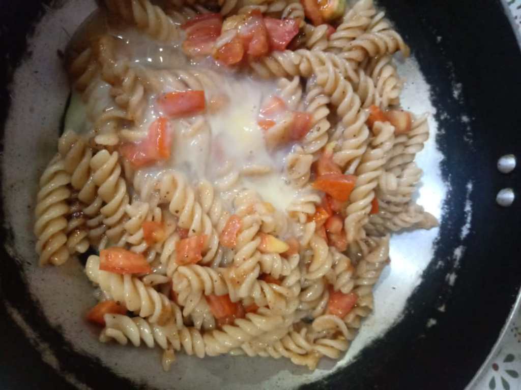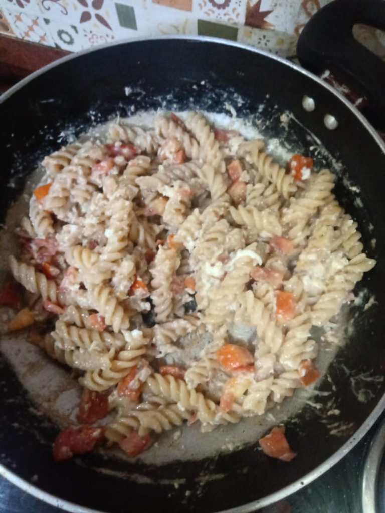 Step 2. Once boiled. Heat 2-3 table spoon of butter in a frying pan and add boiled pasta, chopped tomato and pasta spices in the pan. Mix well.