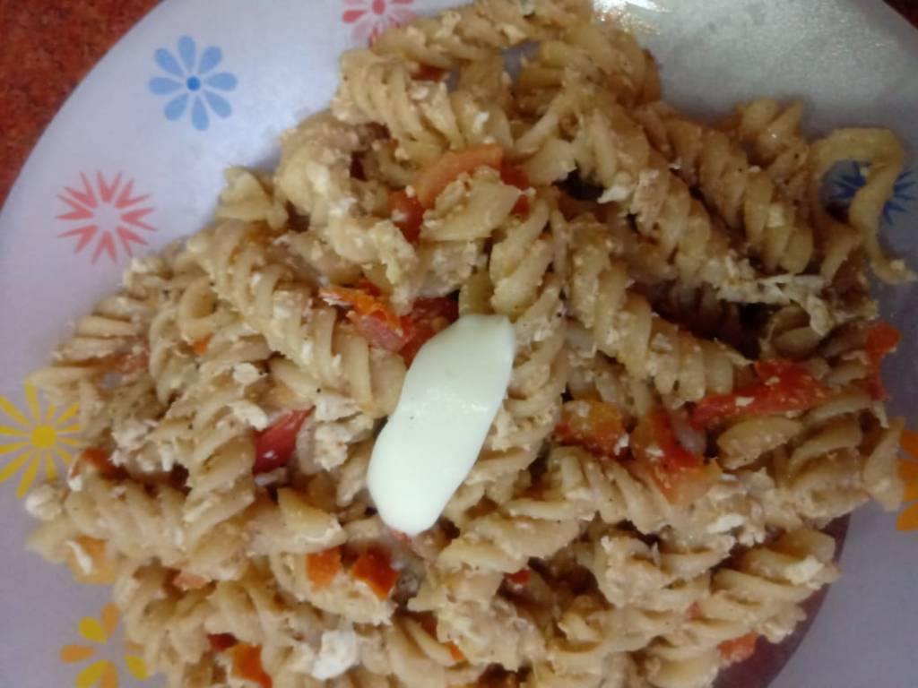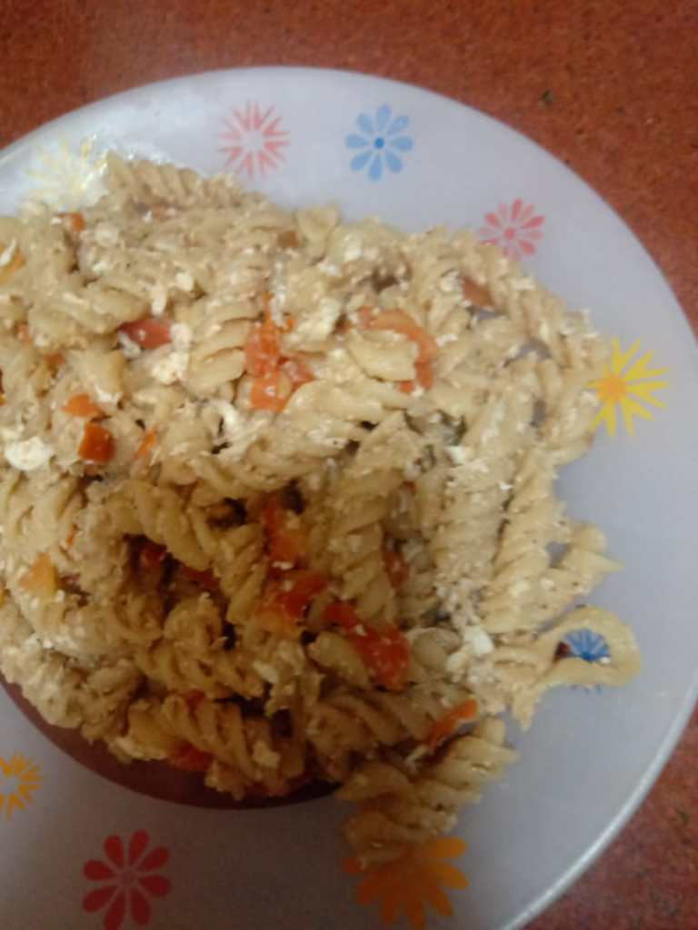 Step 1. When the boiled Pasta is ready and mixed with ingredients. Pour in beated eggs as per quantity, 1.5 egg per cup of dry pasta will make a good taste. This is not same as mixing scrambled eggs in the pasta. As now the beated egg sticks to the pasta and ingredients.