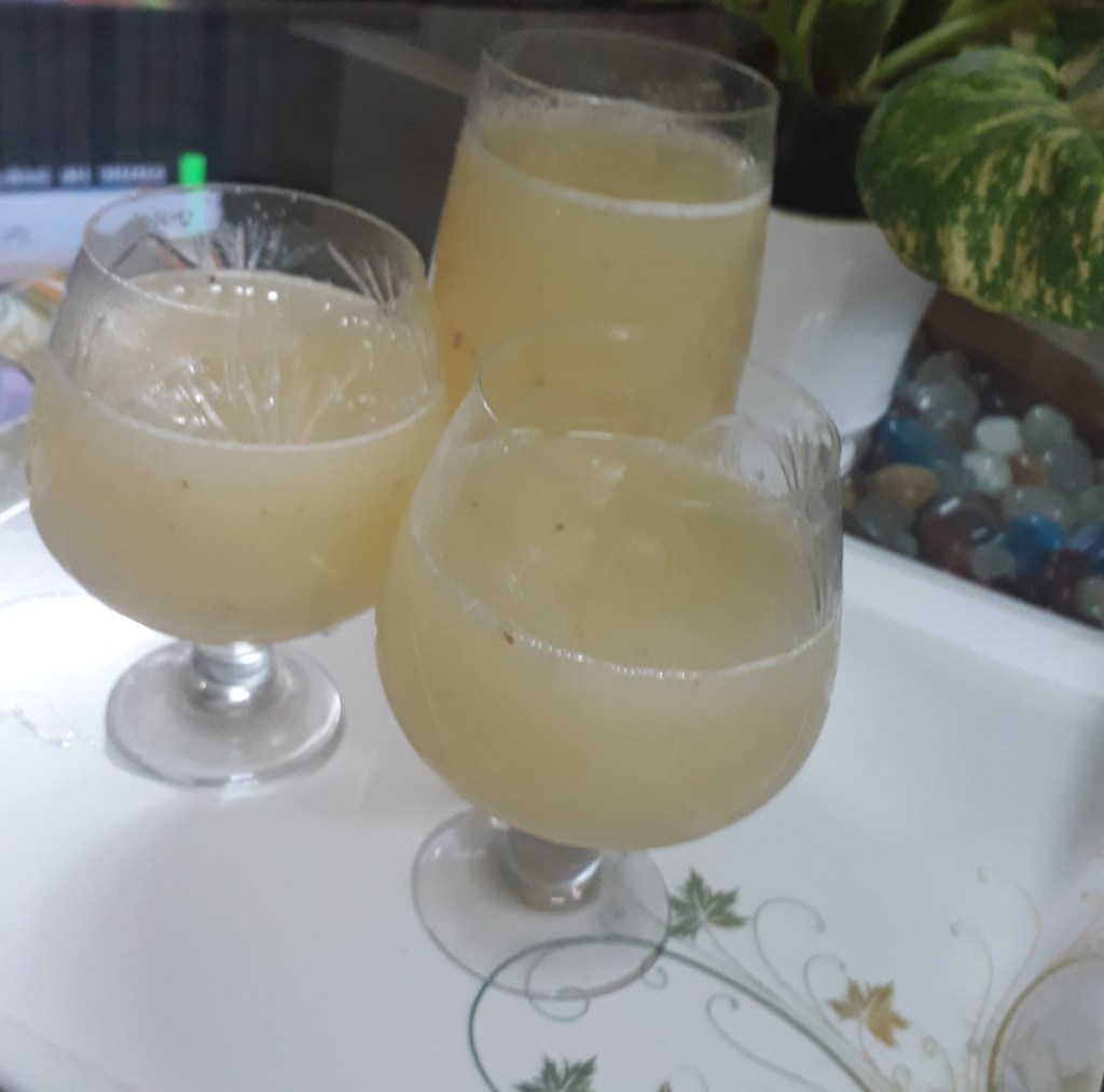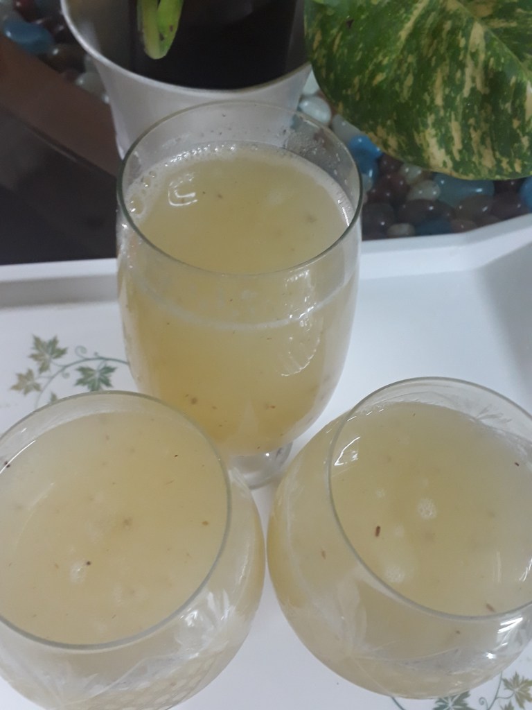 Must try, in summers ! It just needs 2 unripe mangoes, salt, sugar for 3 glasses of exotic drink ! And total 5 minutes in kitchen! Its ready! You can add crushed cumin, mint to add more flavors. That’s optional and only after the first is done. I suggest a thicker version, to feel the sour, sweet taste of unripe mango!