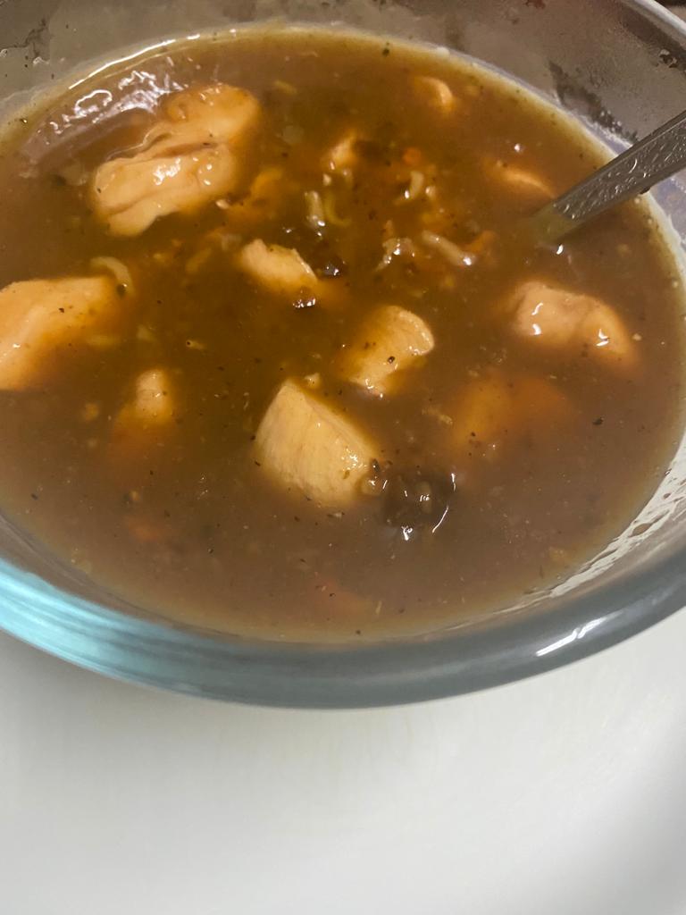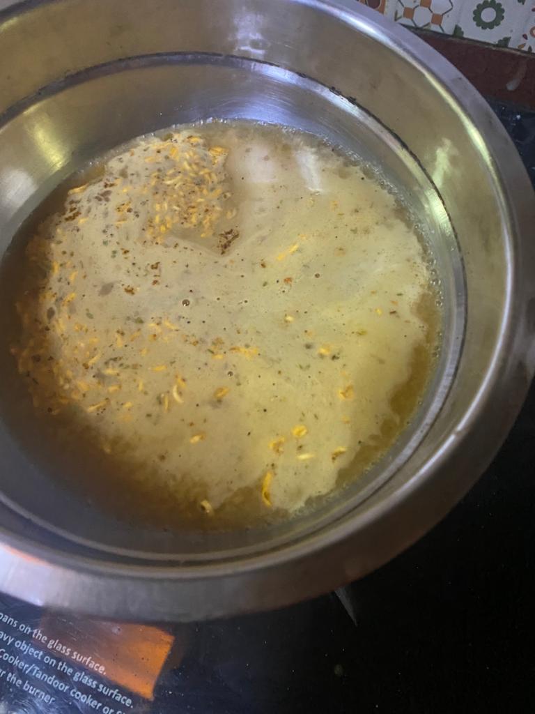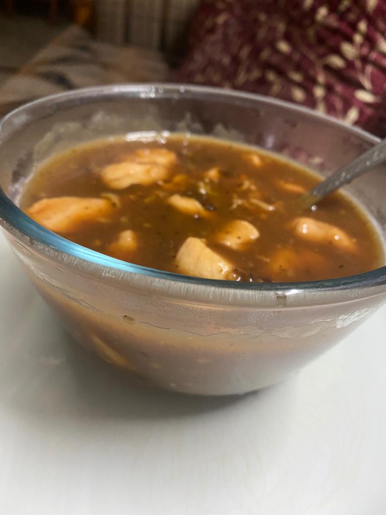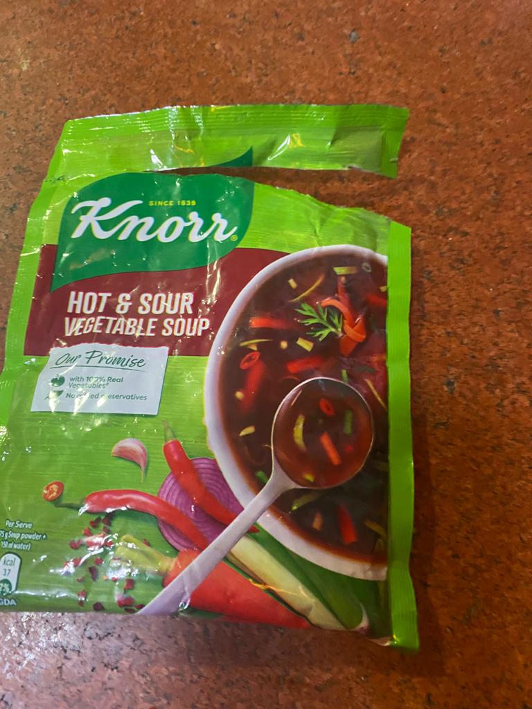 Step 3. Take your favorite soup compatible with chicken. I took — Knorr Hot and Sour vegetable soup. And put it in the heated chicken with water.