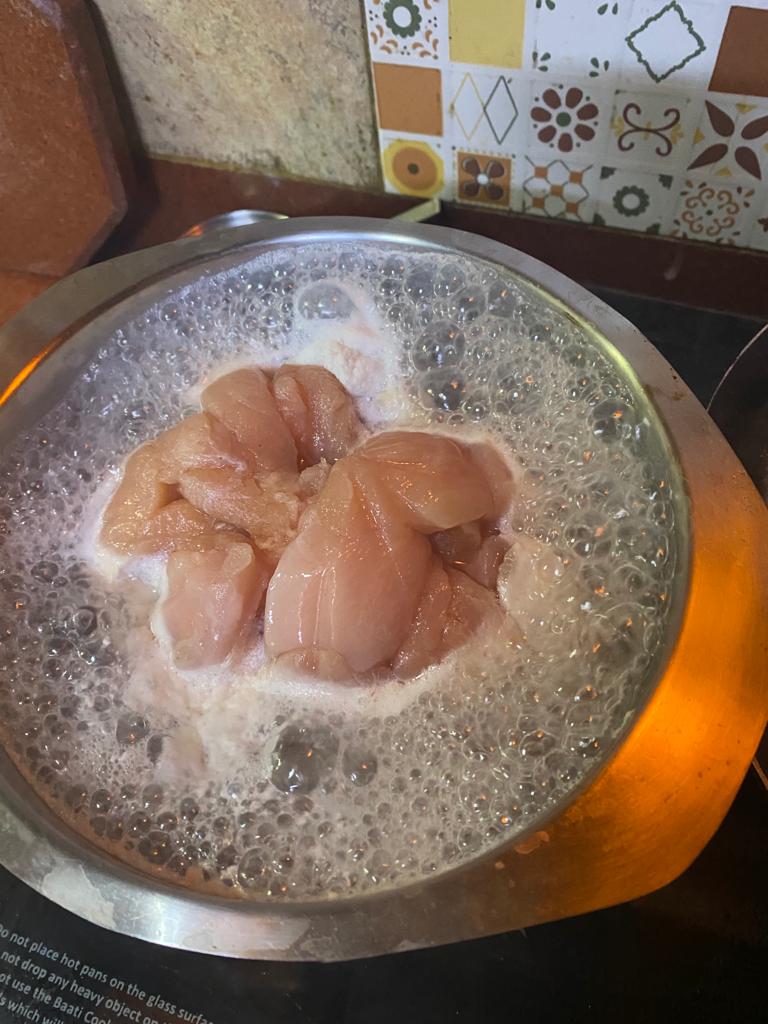 Step 1. Take chicken. I had frozen chicken chest. Boil it in water. For 8 minutes. Just plain water. Go and have music listening for a while.