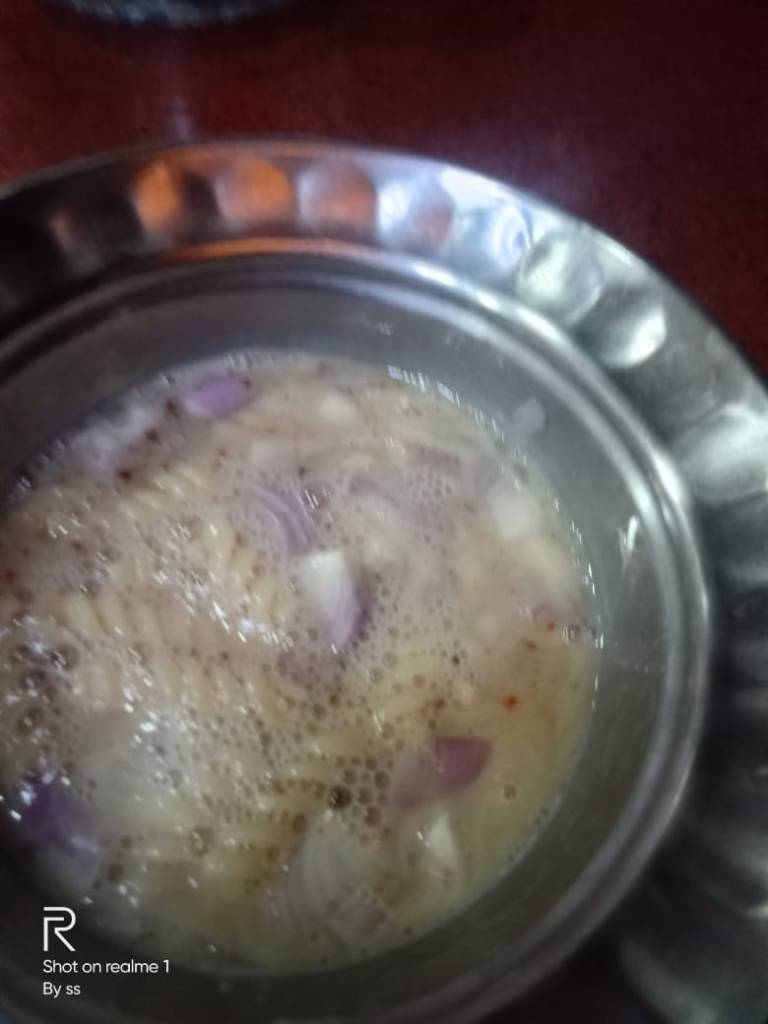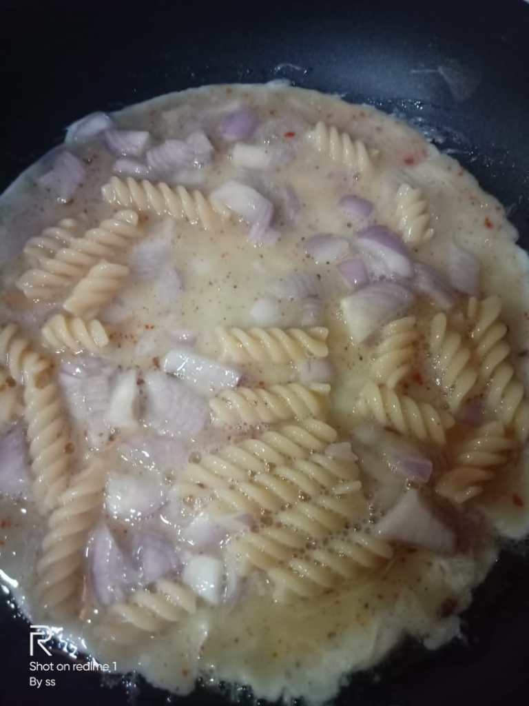 Step 2. Take well boiled pasta of 1 small bowl size. Mix the beat eggs and boiled pasta in a bigger bowl add a small pinch of salt, a big pinch of pepper powder and a very small tinge of red chili. Beat the mixture well. Boiled pasta can be stored in fridge using some oil. You can check this process if you want to store in fridge, I never tried storing boiled pasta. I used fresh boiled pasta while I was doing some other stuffs.