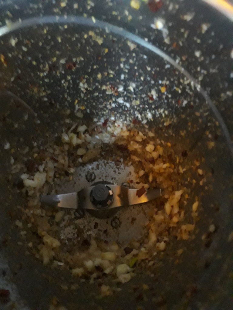 All you need is: 3 raw red chilis, two garlics and optionally coriander power, 1 spoon of butter.