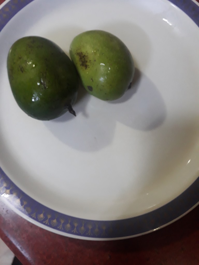 Step 2. Take 2 green mango, which are soft. It gives a mixed taste —Neither sour nor sweet. Its juicy, not hard–and sweet and sour both! A green mango can be kept in fridge for few days to make it sour and sweet, for you to taste it more!