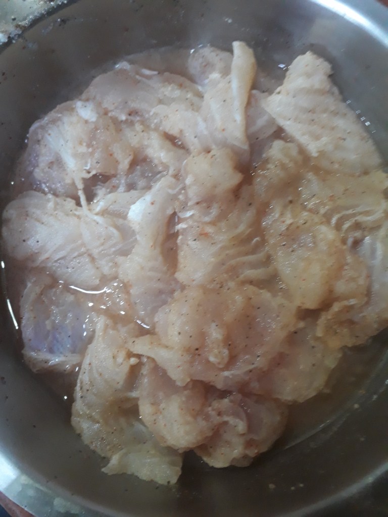 Step 1. Wash fish well and marinate for 10 minutes in lemon and salt, minor salt Basa fish absorbs salt very fast. The process involves in the cut fish pieces squeze 2 lemons and add salt. Mix well, let it be like this for 10 minutes.