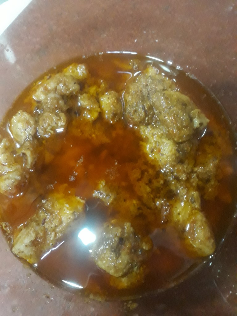 Step 2. Put some extra essential oil in frying pan. This time I tried with a little extra oil -6 spoons– to taste the flavor. Use some beneficial vegetable oil. Heat it and fry the fish in it. Fried fish taste well in curry. You can try non fried fish too, it shall give you a taste which is softer than this one, in case you want to not over use oil.