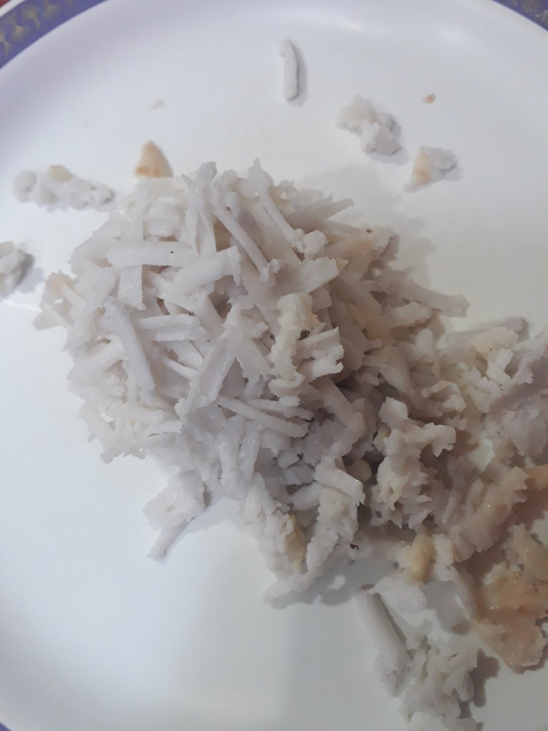 Step 3. After an hour the taro roots are cooled. Then peel off the cover of Taro roots, it wont be a hassle as potato–simple and quick it is. Grate it with a grater.