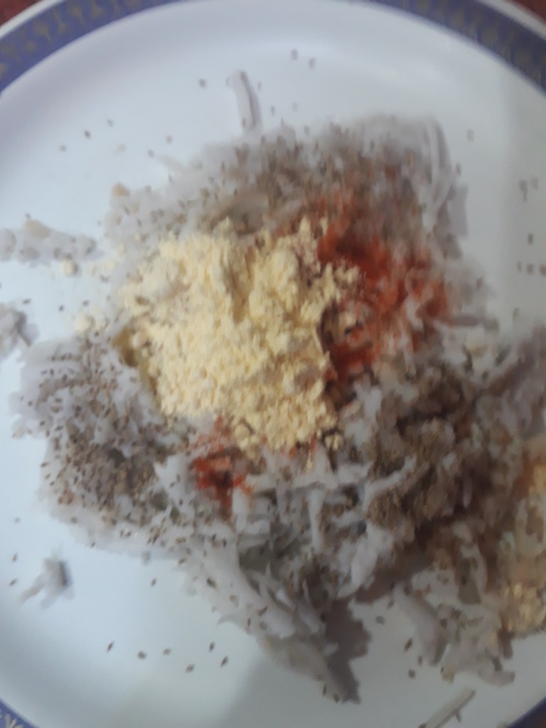 Optionally to add more flavor add—1/2 spoon of carom seeds in this mixture.