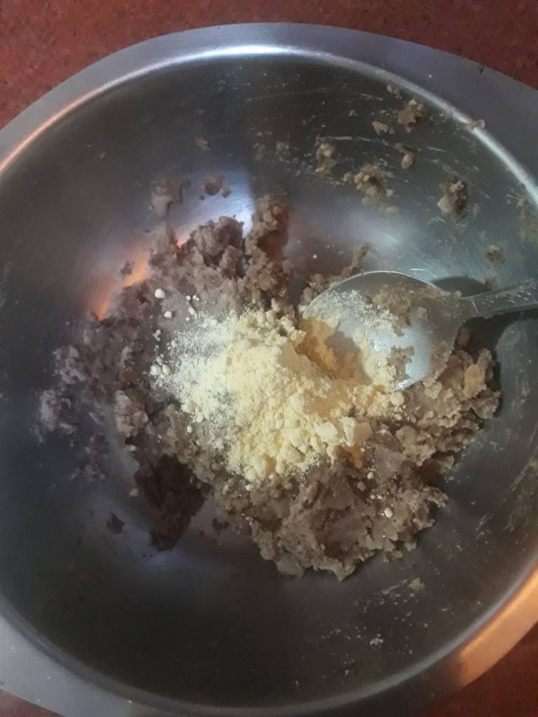 Step 6. Add 1 spoon of substance you use in your cutlet recipe. Its monsoon here, I didn’t opened a new packet of refined flour, instead used gram flour. You can use bread crumps and corn flour for best taste. See what suits you. I used gram flour and have not tried anything but gram flour in this recipe.