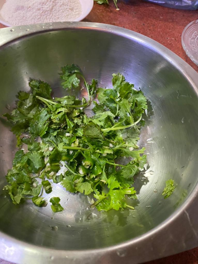 Step 2. Take coriander leaves — 1 handful of leaves without stems and 2 fresh green chili, cut them.