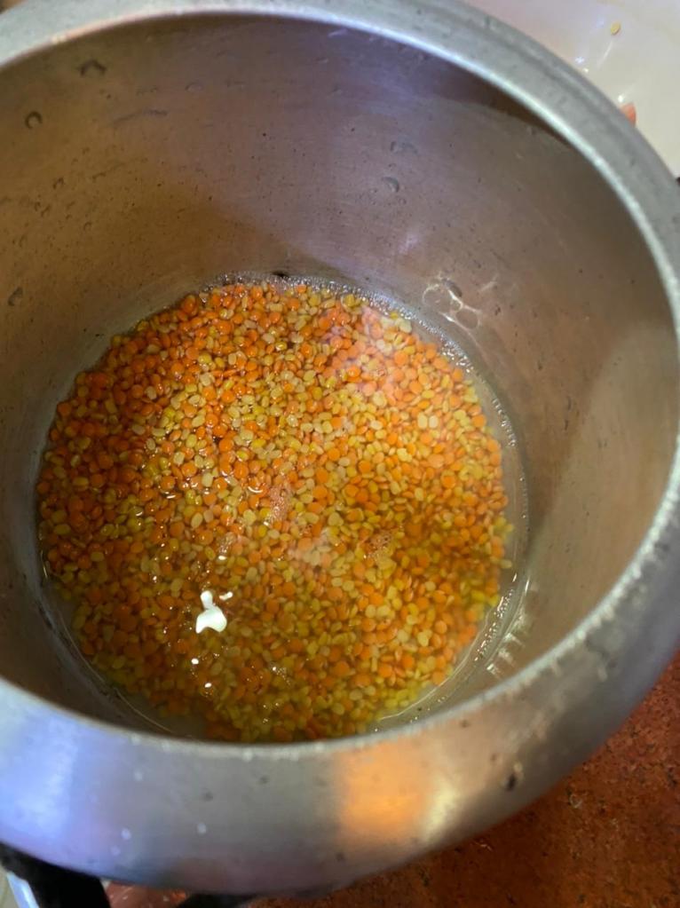 I used the yellow and orange lentils as it gets cooked quite fast. Wash 1 bowl of this pulses and give it a pressure cooker whistle with same amount of water.