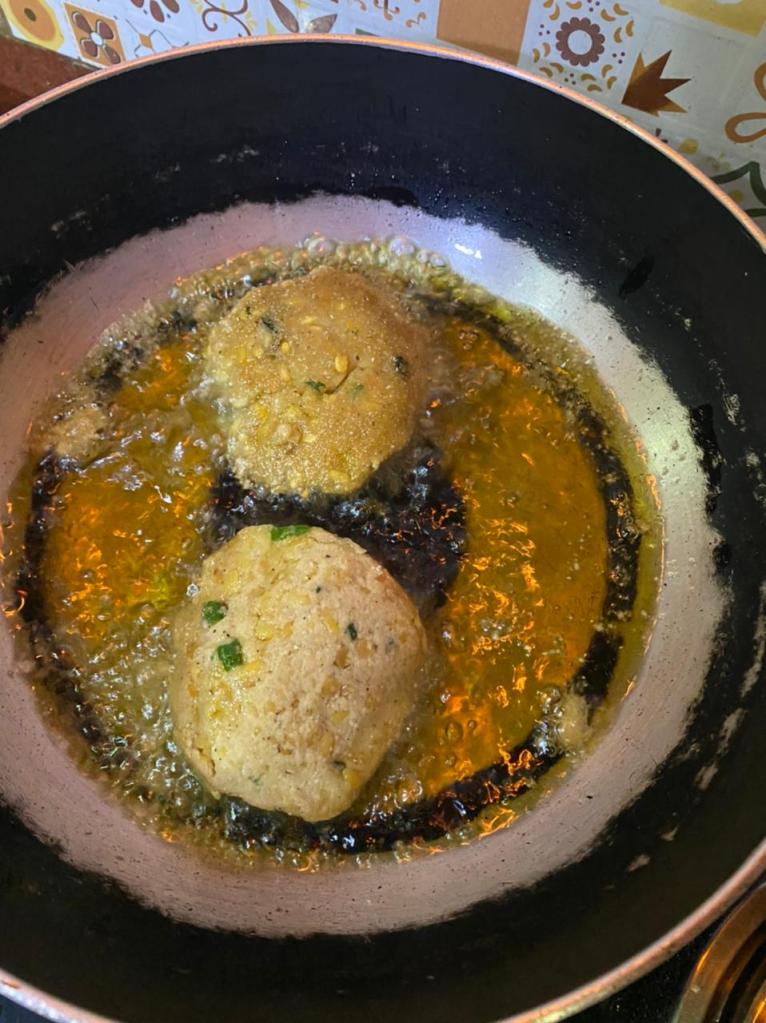 Step 6. Heat oil for deep fry. I used mustard oil. While it heats make the shapes of cutlets. Once the oil is ready to cook, start putting the raw cutlets in oil.