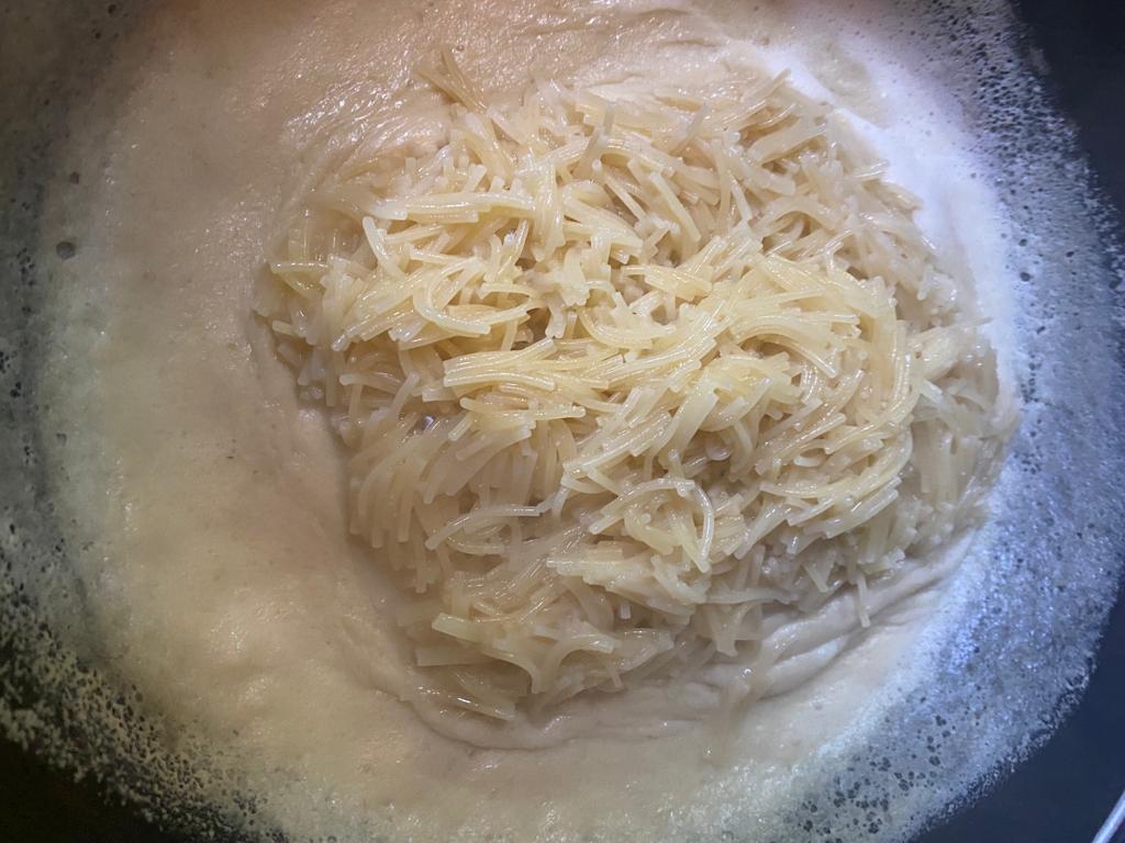 Step 11. bambino vermicelli is ready to be put in solidified milk of peanut. Mix it in pan.