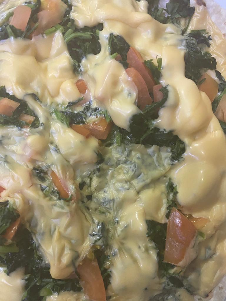 Step 6. Take the Pizza base, I made my own pizza base. And now cover it with the pizza sauce you use. The decorate the pizza base with the green leaves, then tomatoes on top of all this.