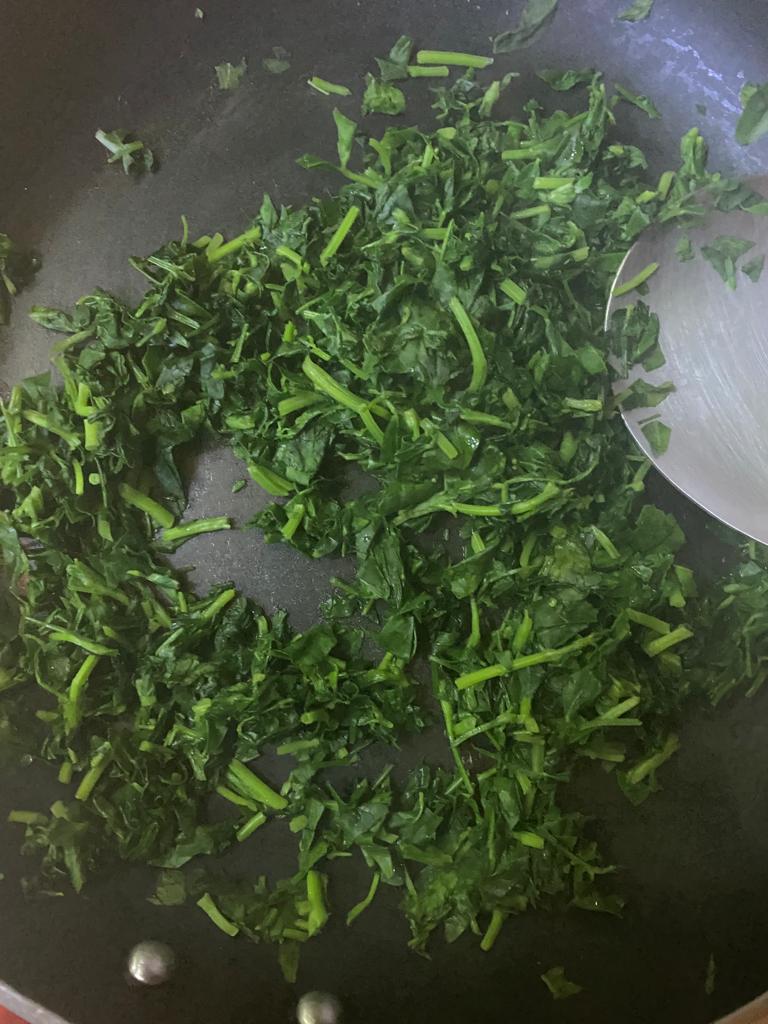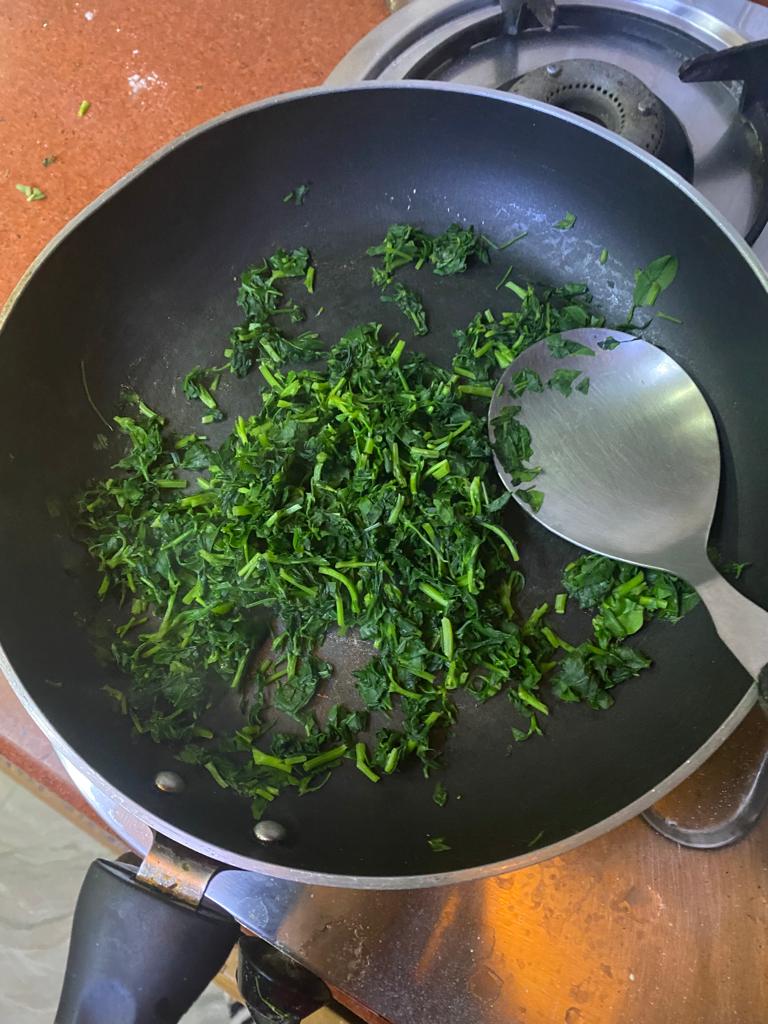 Step 4. Taste it now, it should taste cooked, heat for a while more till it is compressed more and dried little more and that is the perfect taste of fenugreek cooked! Here is how it looks. See how much it reduced in size and quantity.