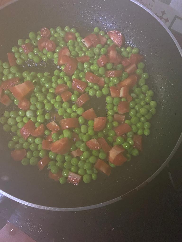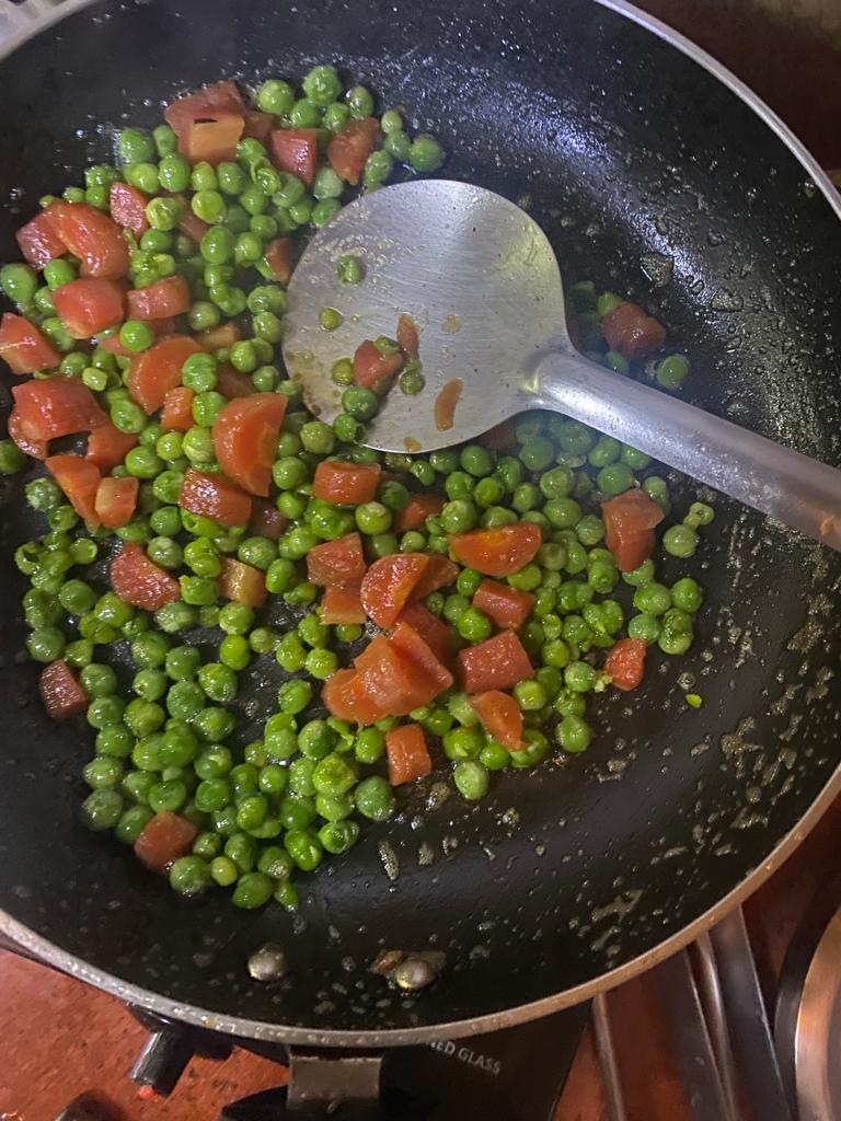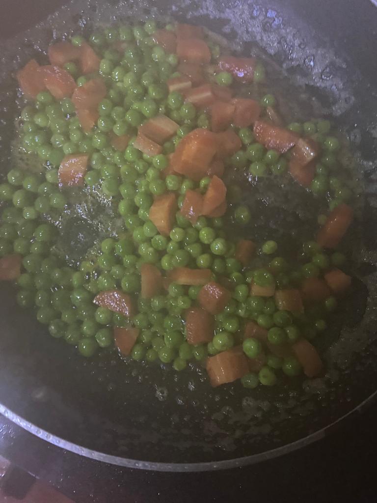 Step 5. Heat this for 2-3 minutes, make sure water does not dry out- it adds taste to the cooked green peas and carrot, when fried in oil before putting in water to make it softer.