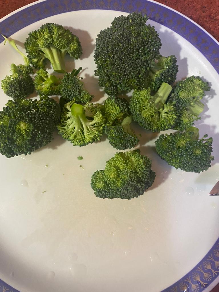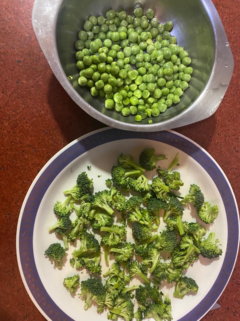 Step 3. Wash one cup of green peas, cut broccoli flowers into even smaller fragments without crushing it, it shall take patience, but it will look and taste and cook well this way. See how it looks now.