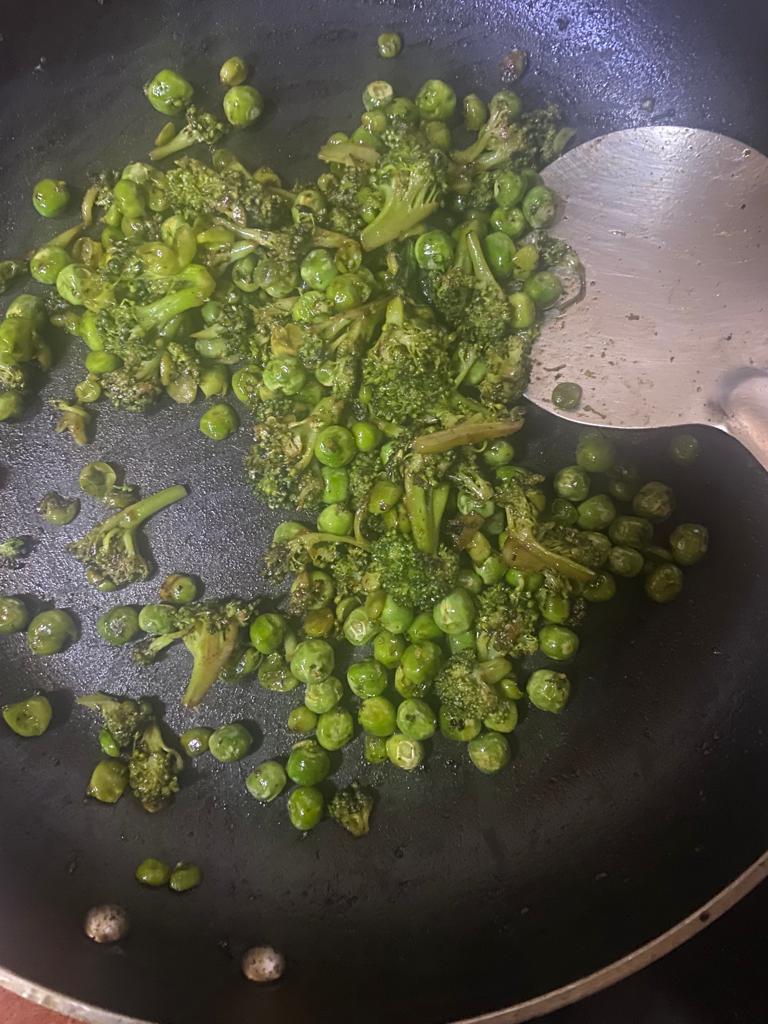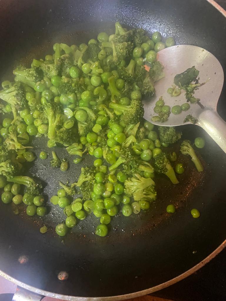 Step 6. Heat it for 2-3 minutes on slow temperature. This way the broccoli and green peas shall absorb the small amount of oil and hence adding taste of cooked food to raw vegitables.