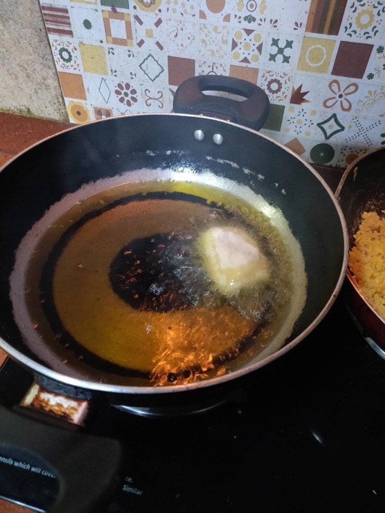 Step 12. Heat oil well and slow the flame, or close the flame and put the piece you made, slowly very slowly, as oil is hot, if you put it with a jerk, it may hurt, so slowly put in, from one side, to other.