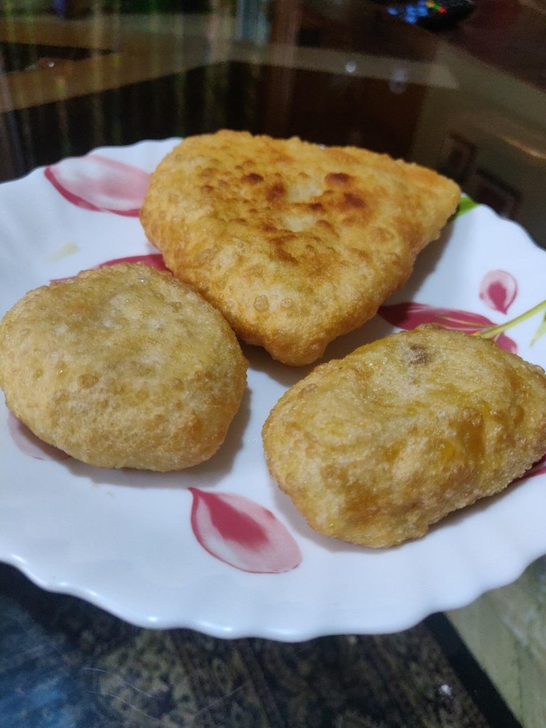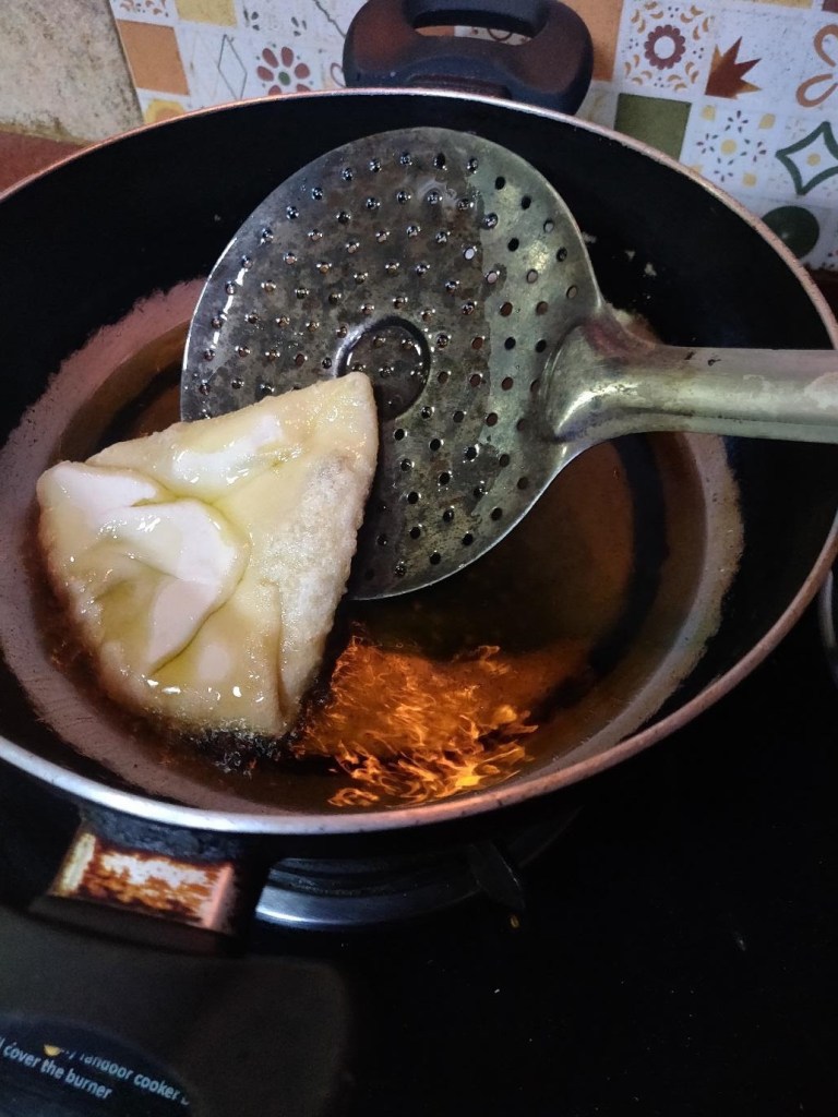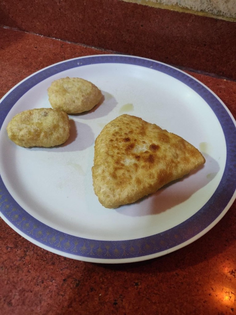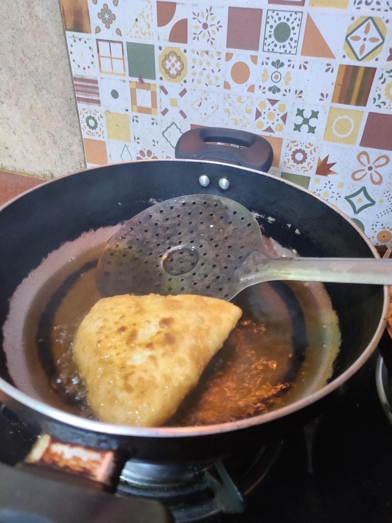 Ingredients: 1 bowl of refined wheat flour, Oil for deep frying – 2 bowls (this shall be all not used, just a dip in oil would be needed, all oil won’t be used, so relax), and 1 spoon of black pepper and raw red chilli-1 + the filling of Puff you like—I took lentils as filling.
