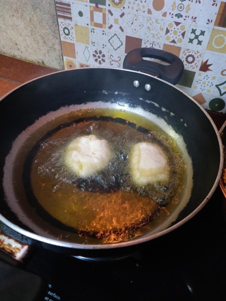 Step 21. Put it slowly in hot oil, and let it cook. Flip the side now.