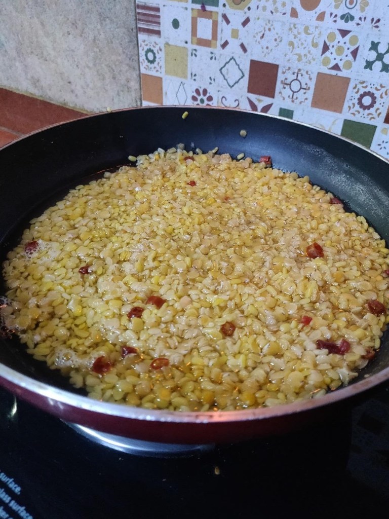 Step 4. Heat it in pan for 5 minutes, and till double amount of water makes lentils soft to eat.