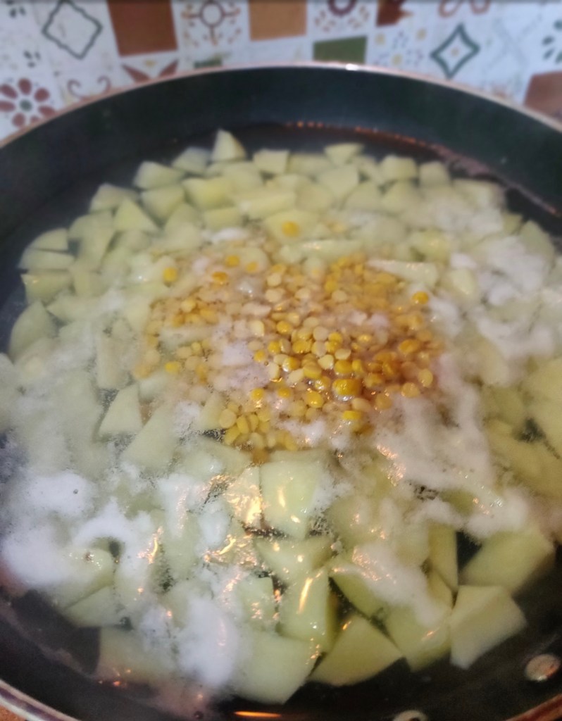 Step 5. Put the split chick peas and potatoes in pan with 2 bowl of water. Make sure all is dipped well in water. Extra water can be dried by heating in the end.
