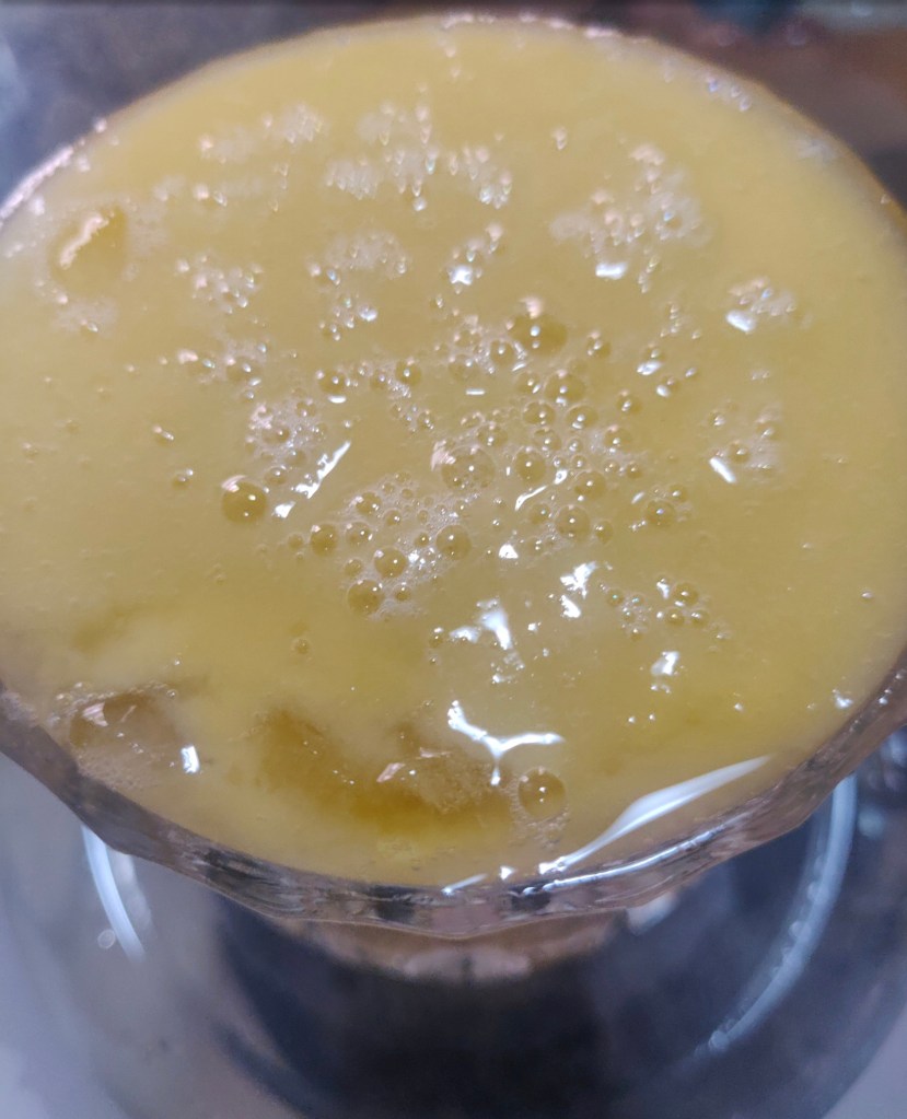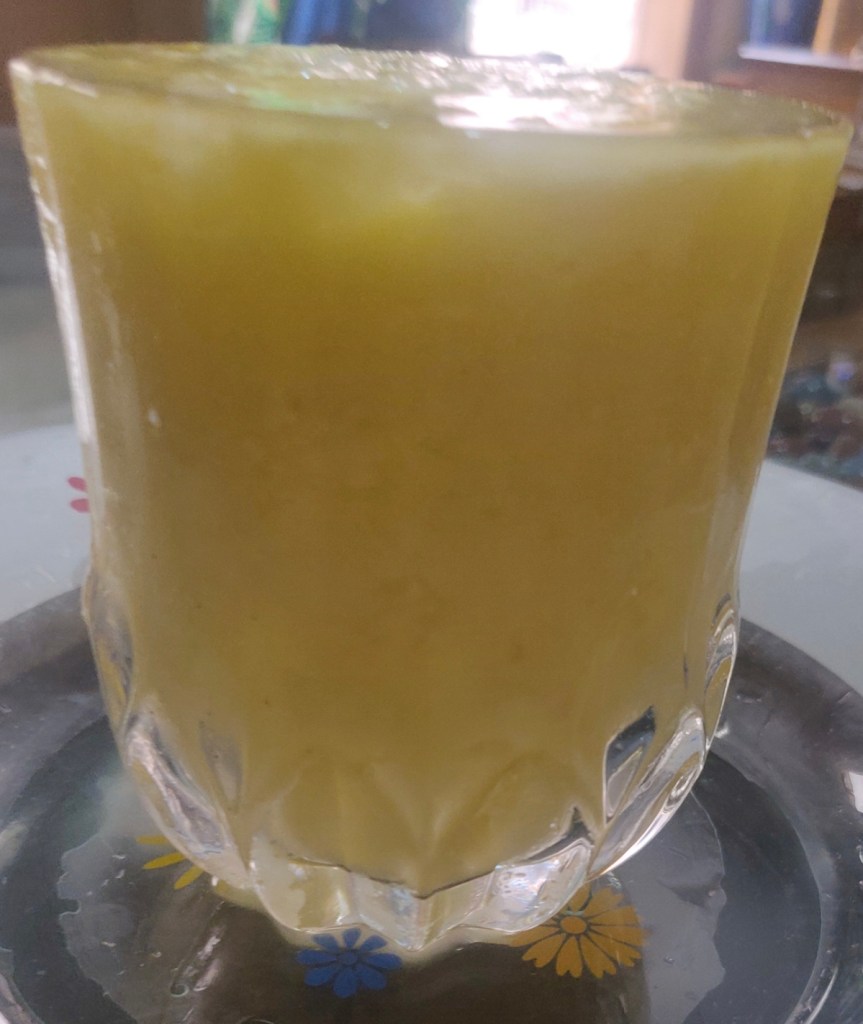 Step 6. Grinde mango in clean mixture grinder. Put some pulp direct in glass, to fill one-fourth of grinder. Remaining pulp of mango, put in handful of ice, and Limetta juice, extracted above, one without fibers.