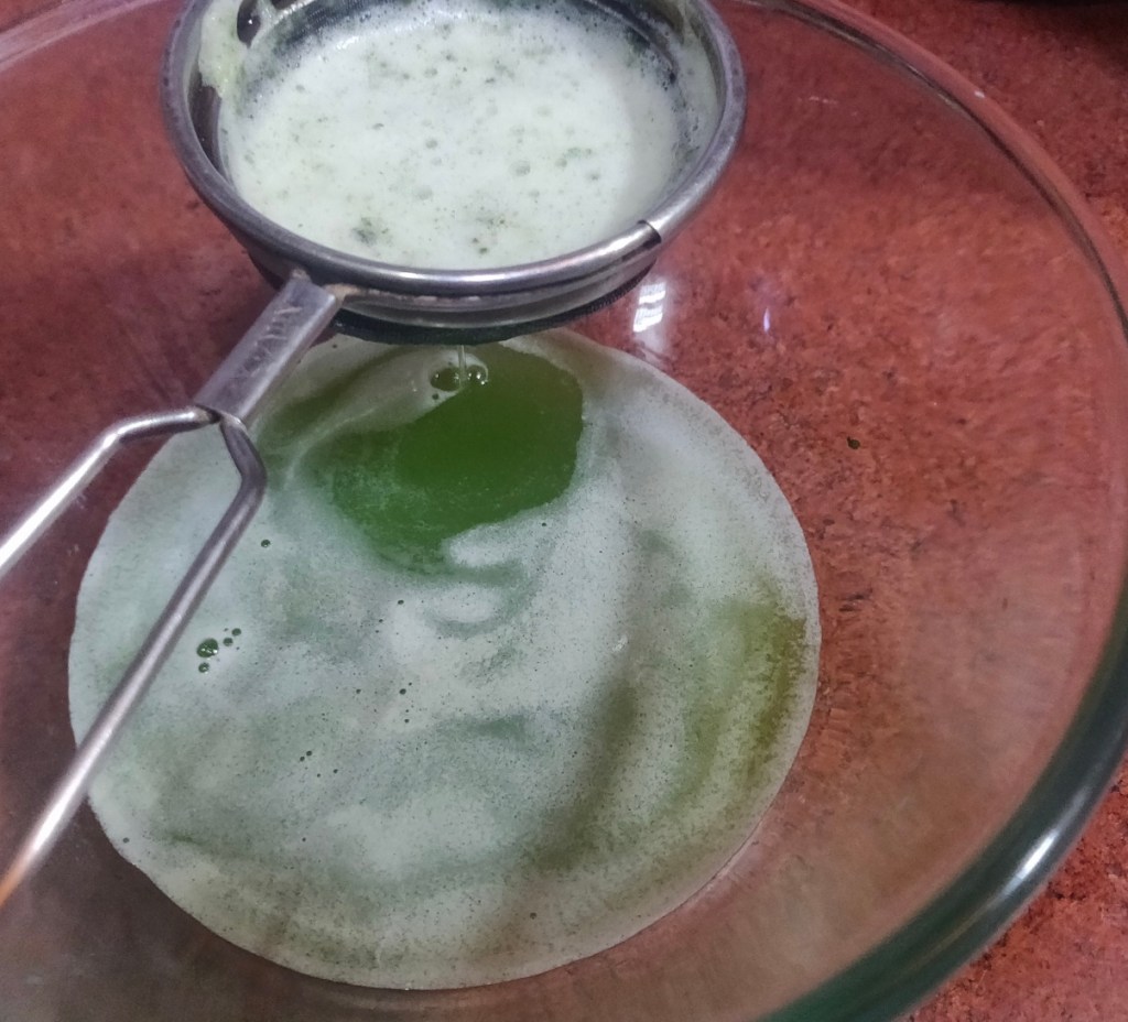 Step 3. Now, use a sieve and take off the fibers, so that drink is crystal clear, it takes color of mint. If you have a juicer you can try this in juicer. Here there is hand-pressed juicer, but I choose this faster way.