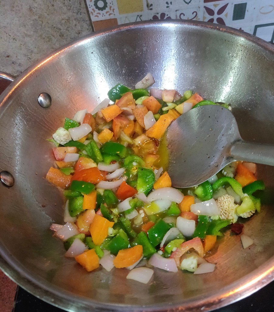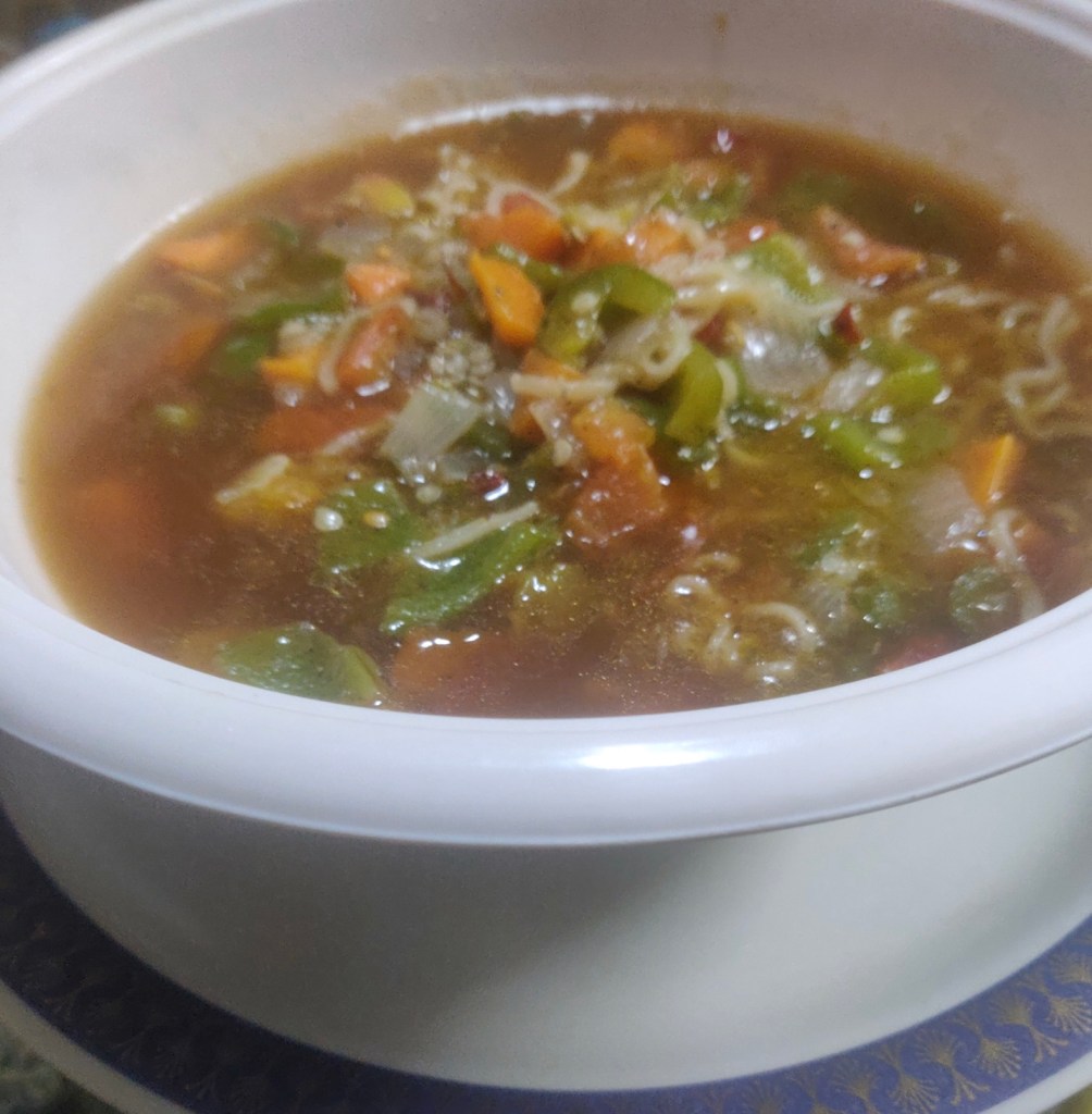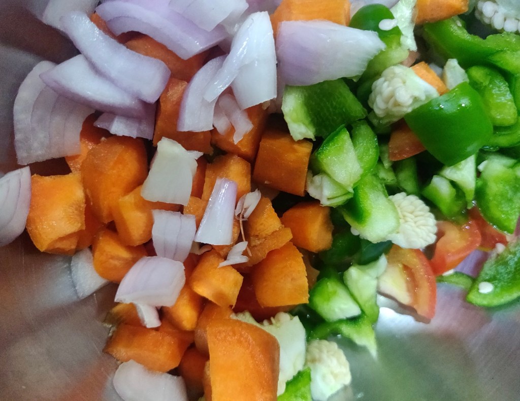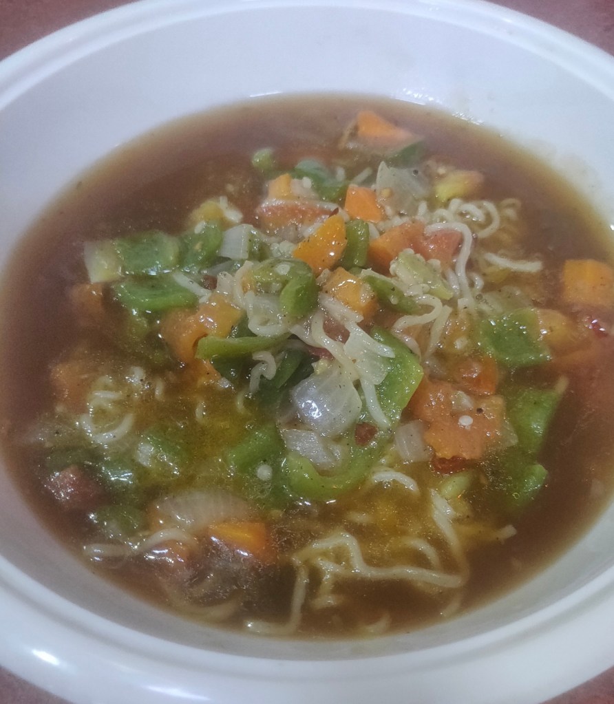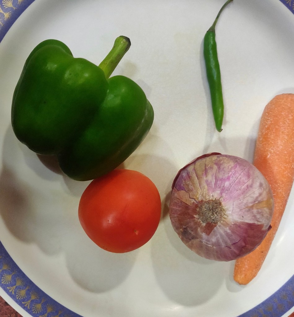 Ingredients: 1 capsicum, 1 onion, carrot, tomatoes and any other of your favourite vegetables, I was not in mood to add beans, in this, as it can make taste blant. Oil, 4 spoons, 1 knor hot and sour soup. I used this. You may try your combination.