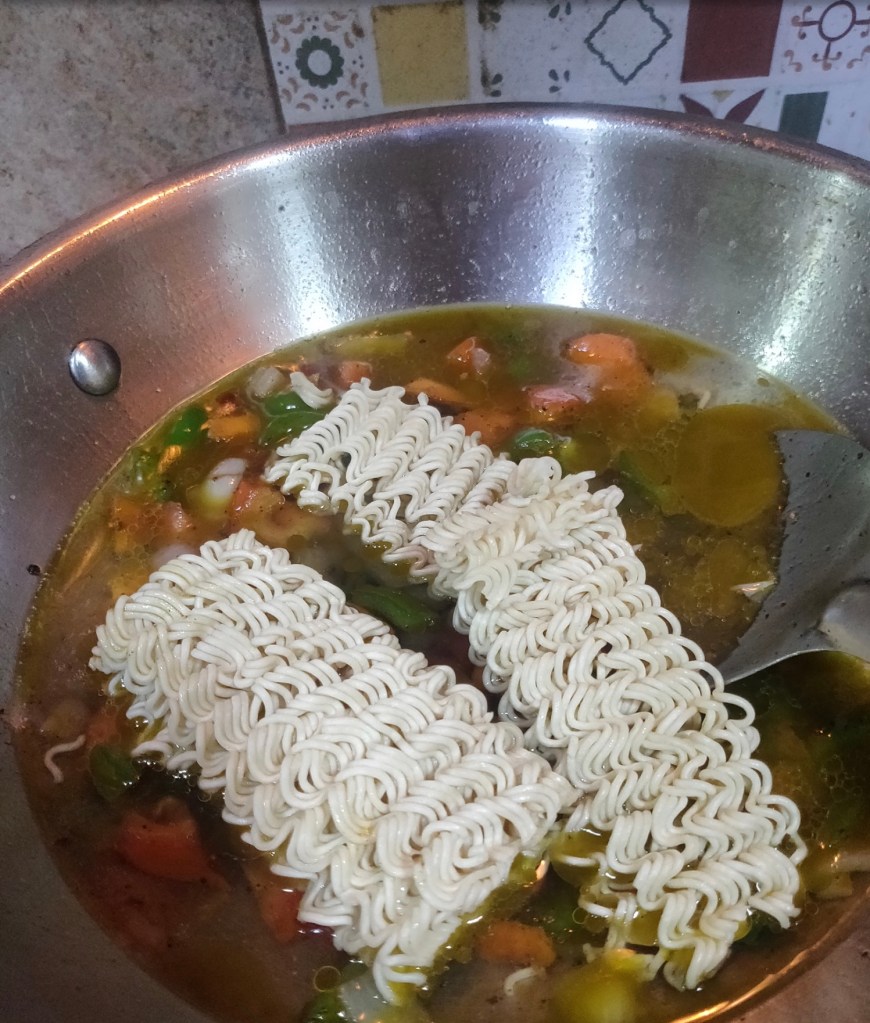 Step 5. Put dry noodles in frying pan. I had Maggi noodles so I used just the noodles from it, I didn’t use the taste enhancer with it. Add water in pan, 2 cups.
