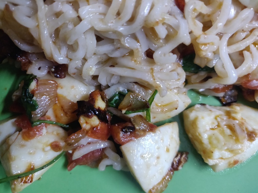Ingredients: 2-4 eggs, 2 tomatoes, 1 onion, garlic, ginger, black pepper to be added in end, oil, noodles of choice