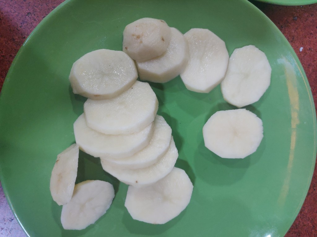 Step 5. Take 2 potatoes, peel them and cut them vertically in same shape as cottage cheese.