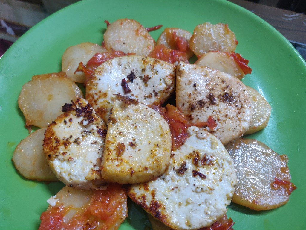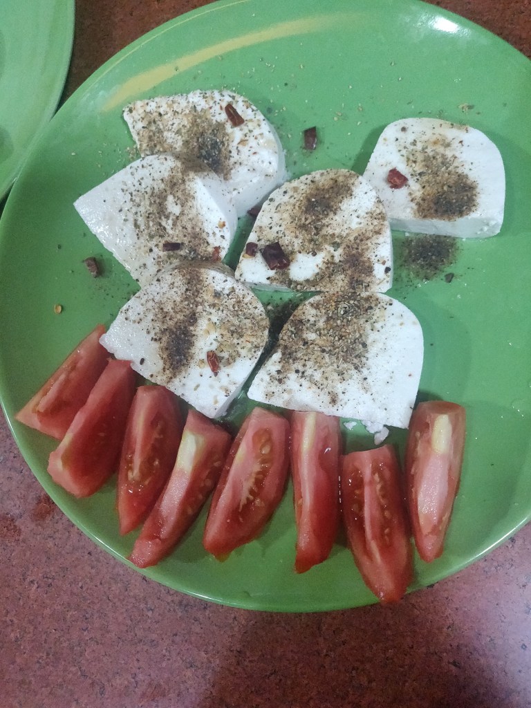 Ingredients: 2 Potatoes, 1 tomato, 250 grams Cotton Cheese, 1 lemon, Black Pepper, optional, pasta seasoning to marinate cottage cheese.