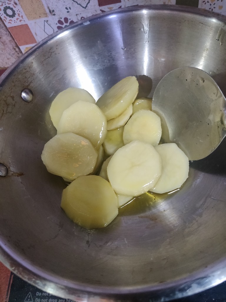 Step 7. Add potatoes in pan, mix the cut potatoes in the pan.