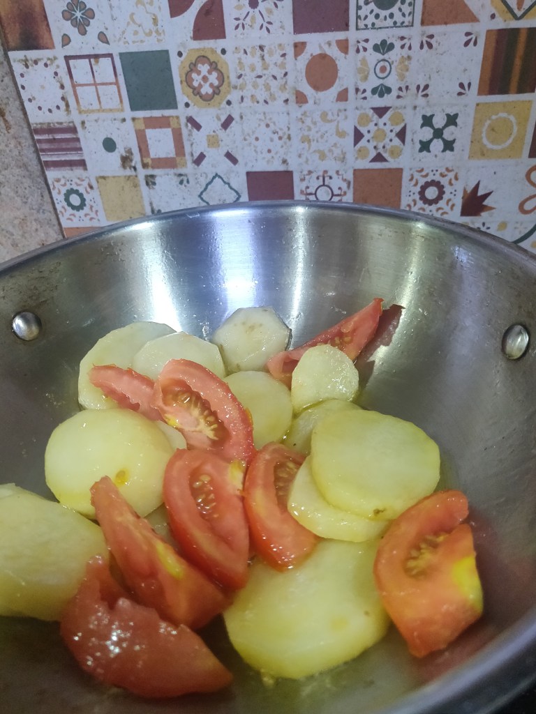 Step 9. Put these tomatoes in frying pan, the reason you add tomatoes is it is watery and lessor oil shall be used to make potatoes soft, apart from adding tomatoes flavor. Tomatoes have water content, so try on closed stove. Switch on stove once all pieces of tomatoes as in pan.