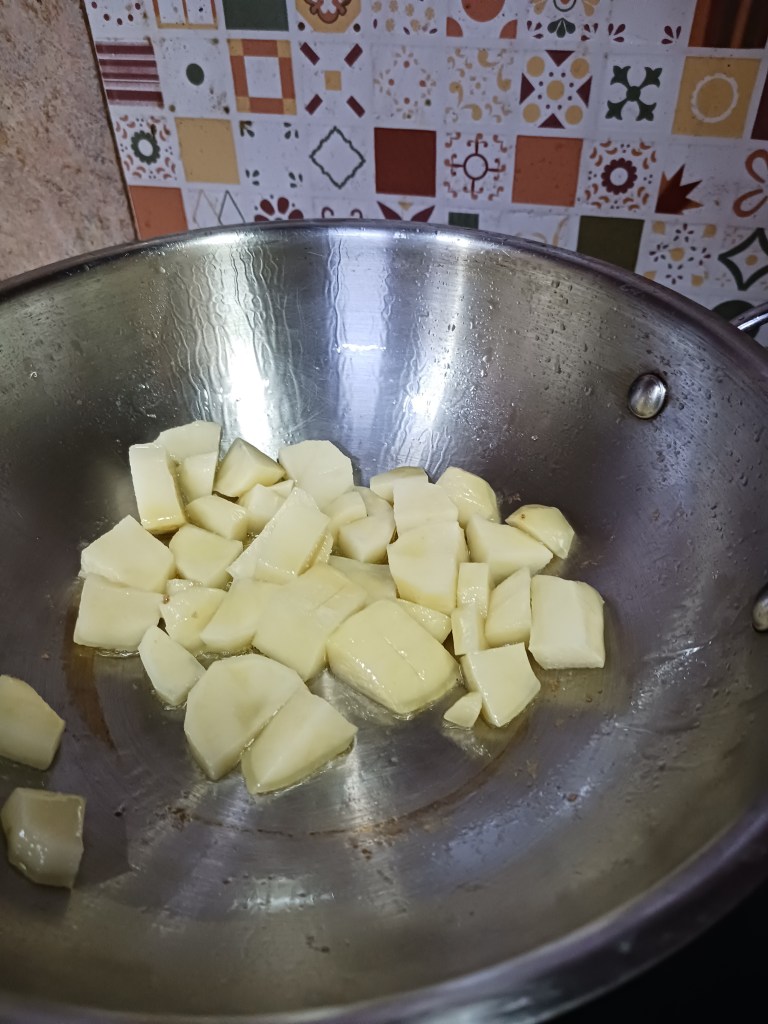 Step 3. Cut potatoes into small parts and put it in frying pan
