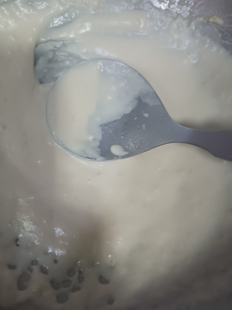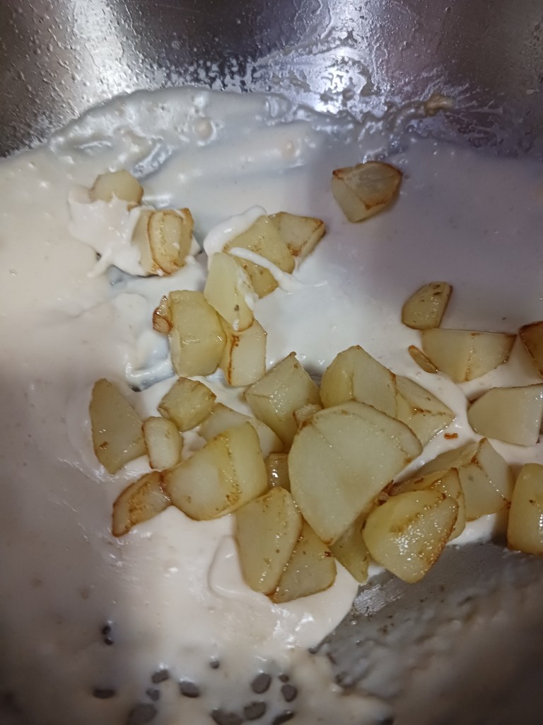 Step 9. Once mixture is nice, and smooth, add remaining milk and keep moving. Then add the processed fried potatoes in this mixture.