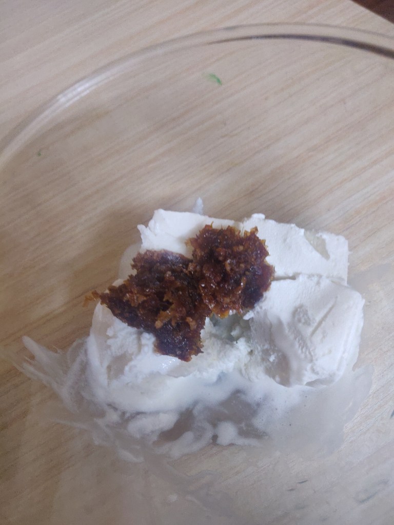 Step 2. With a serving soon break this ice cream as we want to mix in it rose preserve.