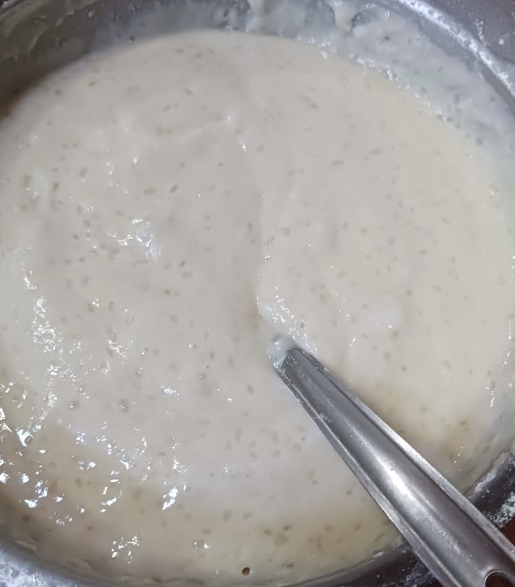Step 3. Mix it well, if the spoon can move freely in the mixture it’s fine, else add small amount of milk, step by step, so that the batter is smooth, for spoon to mix and its can be taken up and the it’s kind of thick and viscous.p and smooth to run spoon in it.