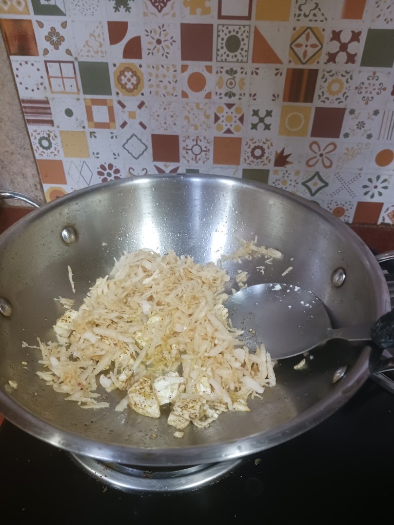 Step 5. Now radish is cooked, more dry and heated as well. Close heating of pan.