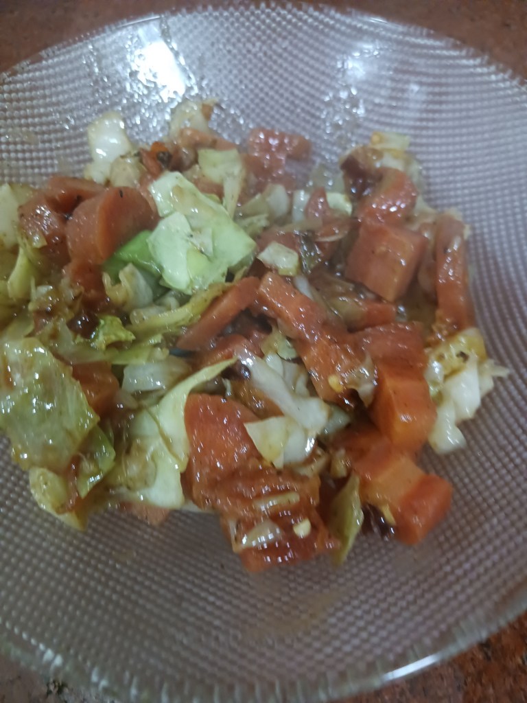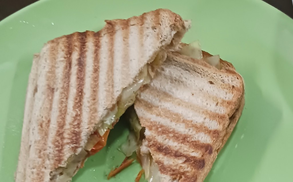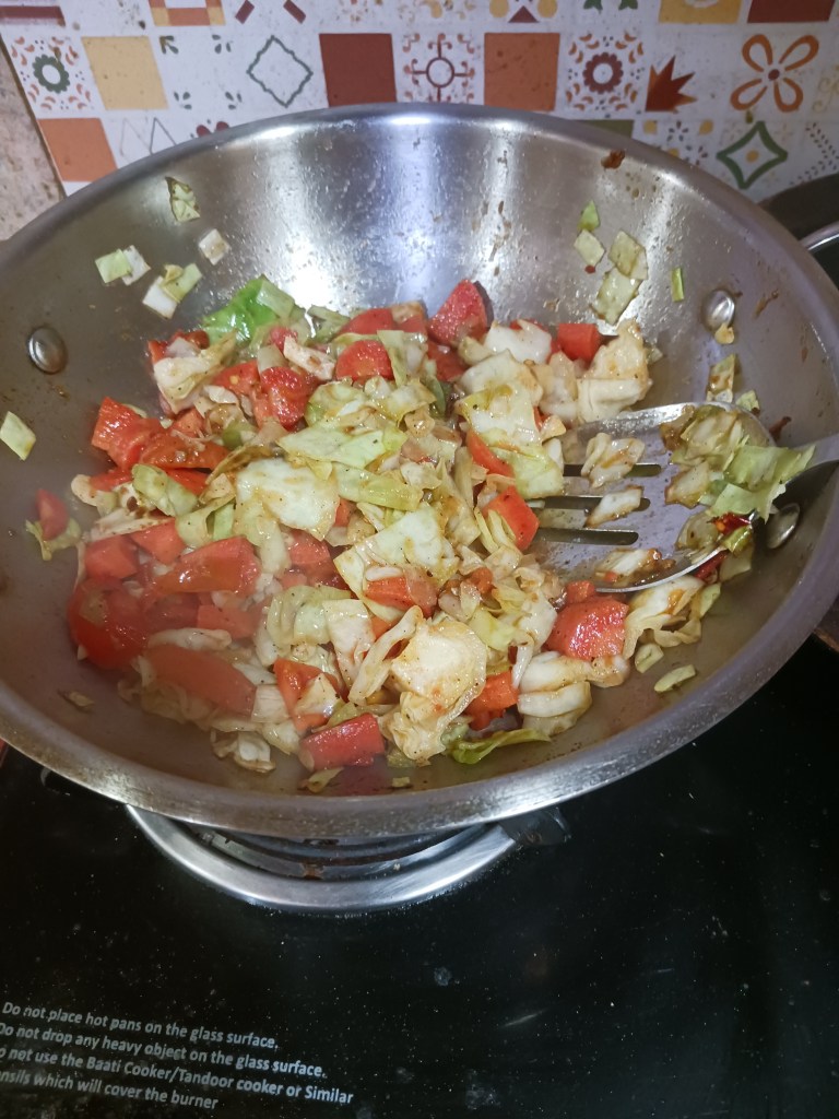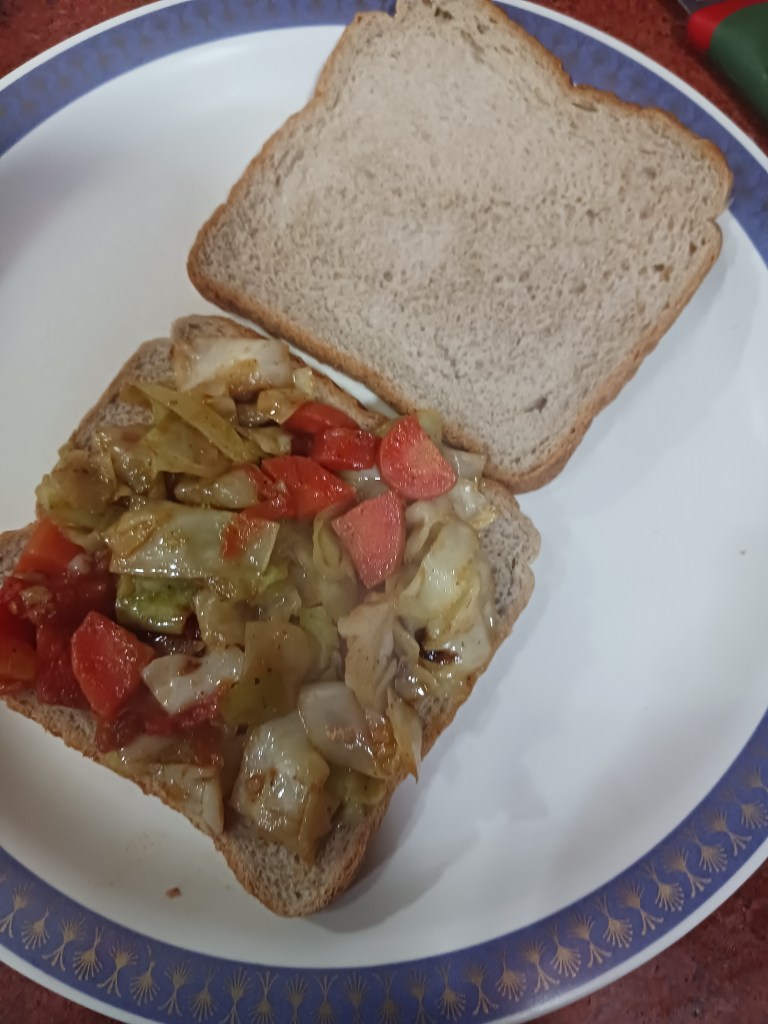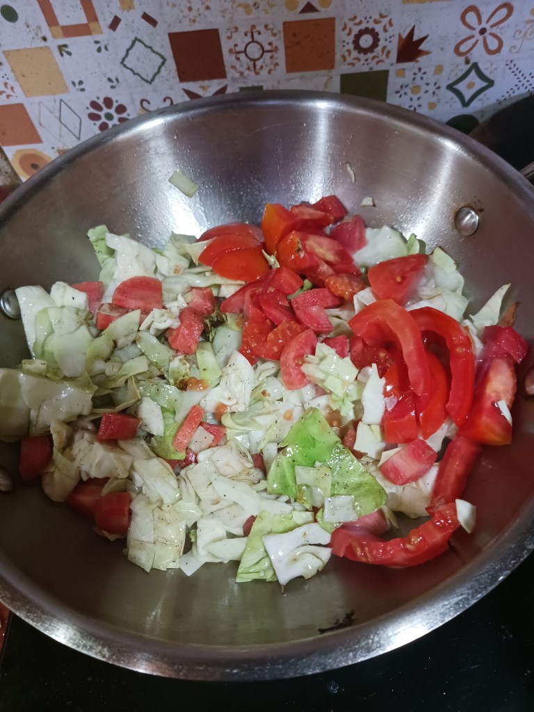 Ingredients: Vegetables- carrot, cabbage and tomato, bread, oil, black pepper, salt