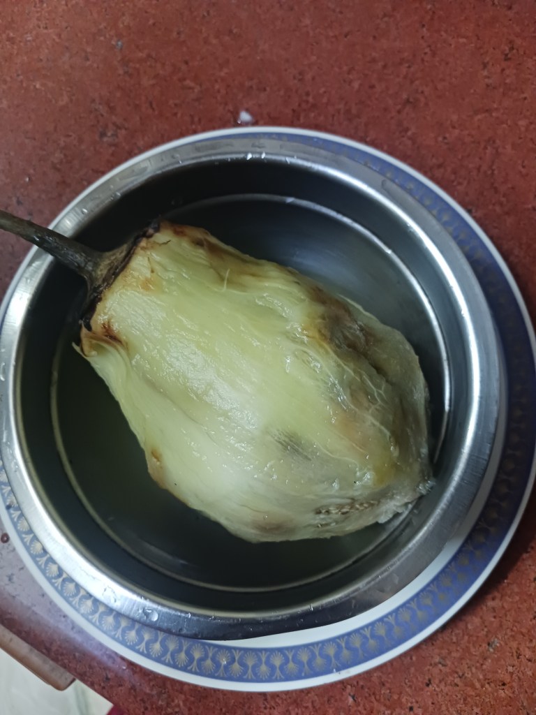 Step 4. After 3 to 4 minutes the skin of brinjal will start to tear off. Take it off the gas and put it in a large bowl half filled with water. With a knife start peeling off the outer cover.