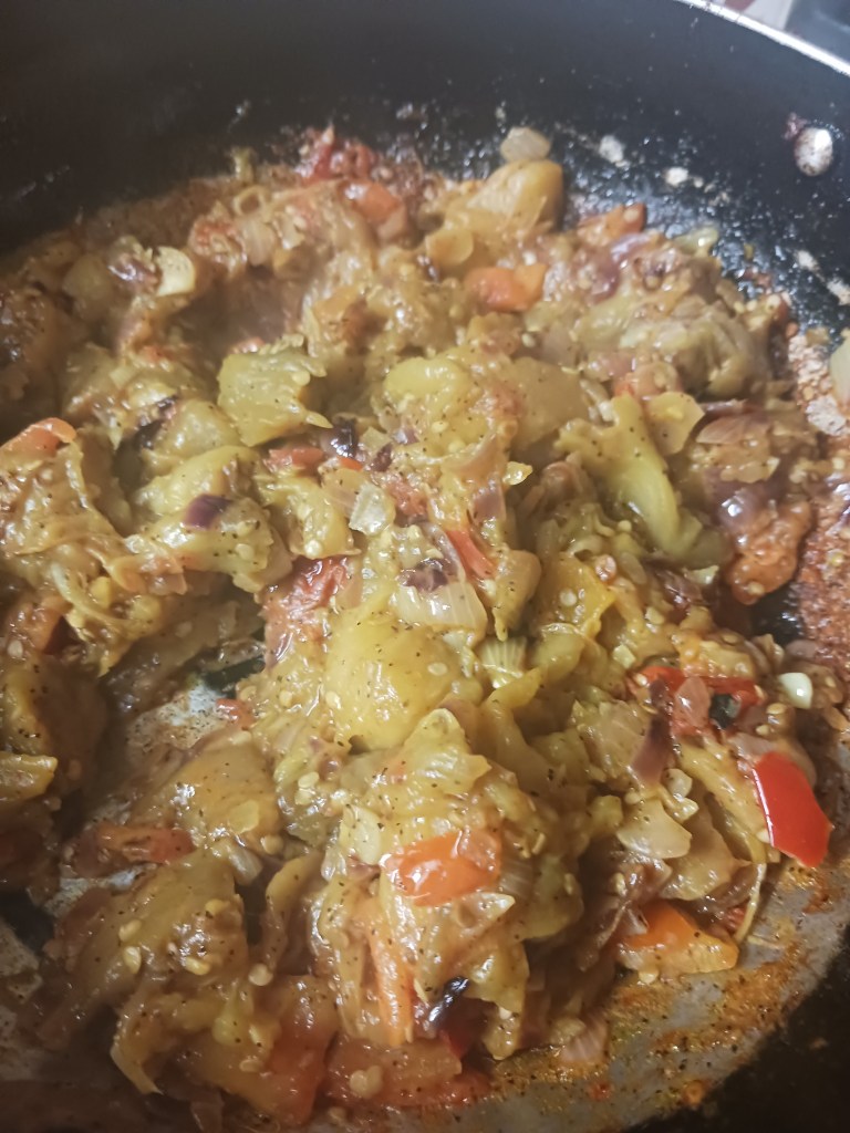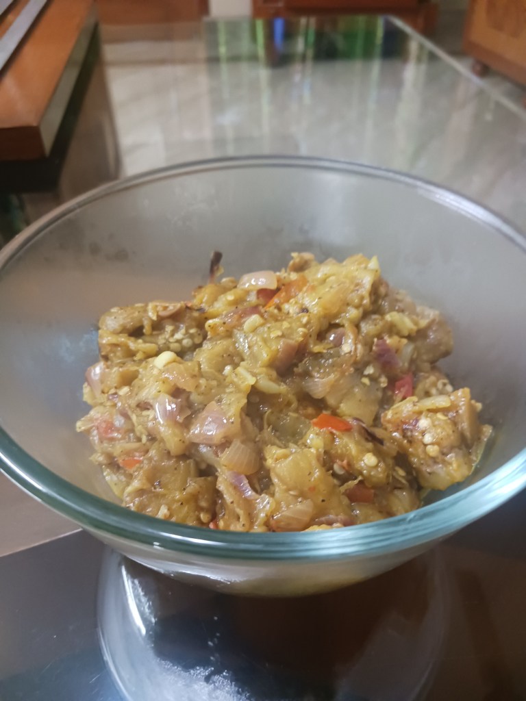 Step 7. This is how it looks like, small fragments, which are soft as heat penetrate inside brinjal in step 3.