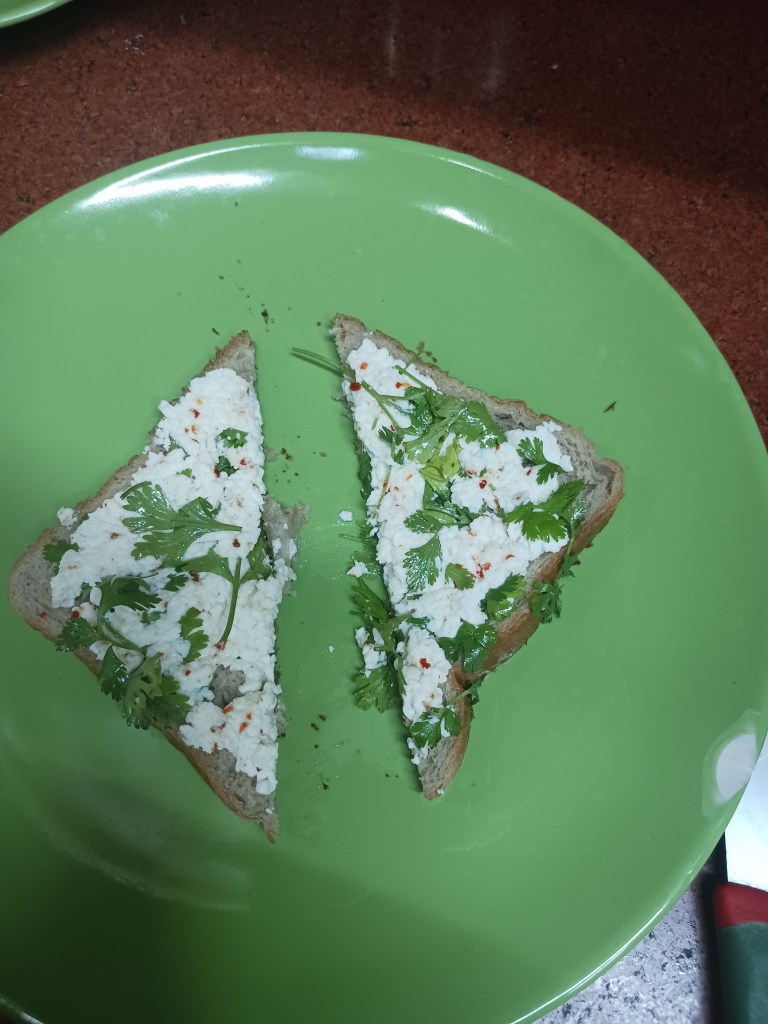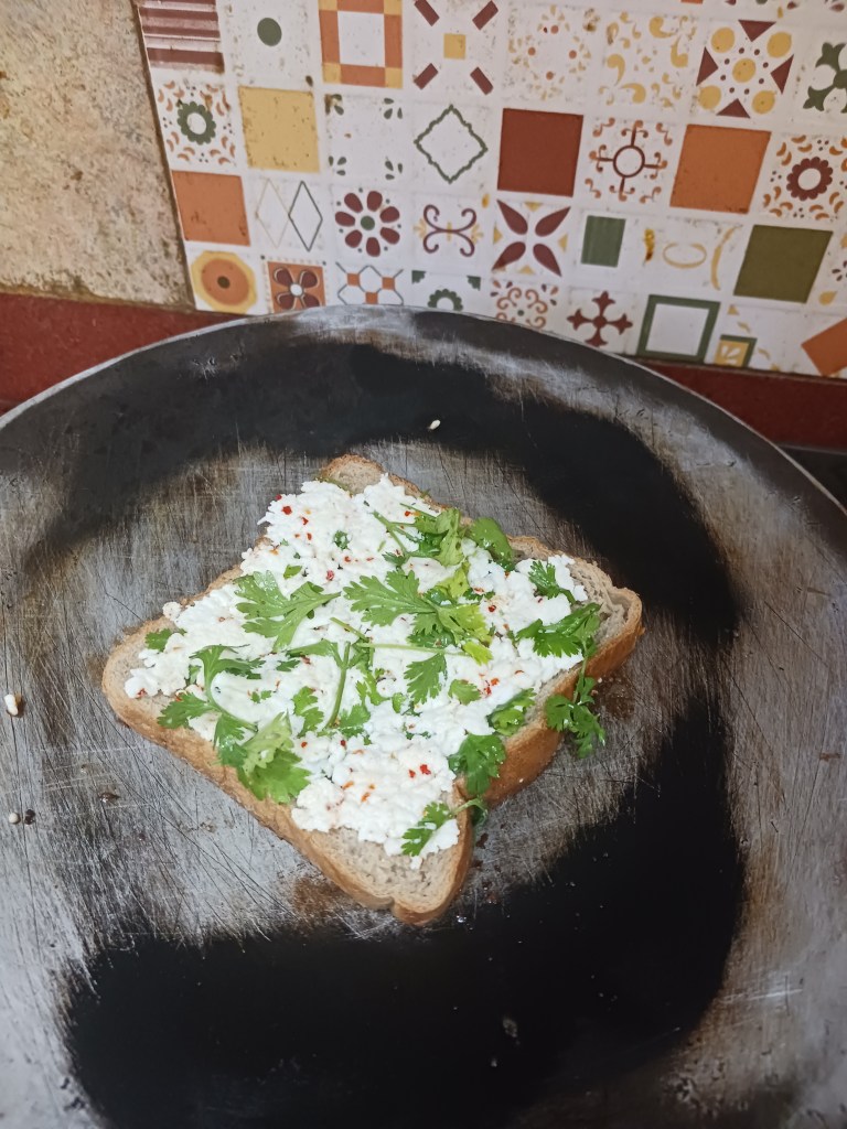 Ingredients for one: Cottage cheese, daily bread, coriander leaves, salt, red chilli, black pepper.